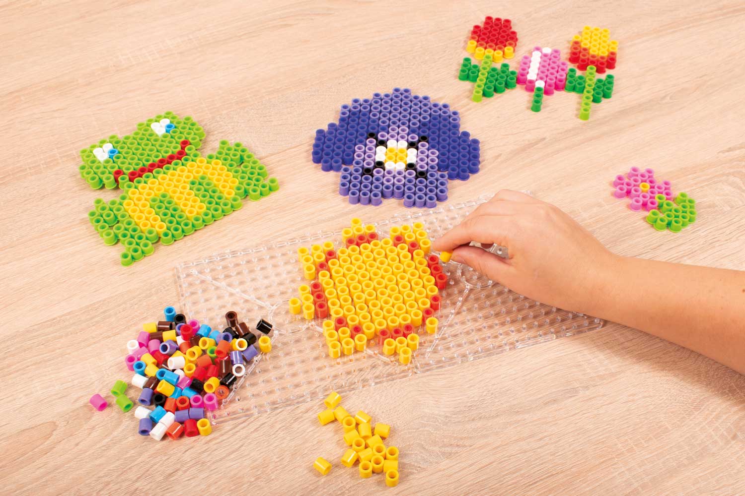 Similar a los abalorios para planchar tradicionales, pero con un tamaño agrandado para una manipulación más fácil por parte de los niños. Explora la creatividad creando patrones en 2D con estos abalorios en las placas con picos. El paso de soldadura con la plancha debe ser supervisado por un adulto.