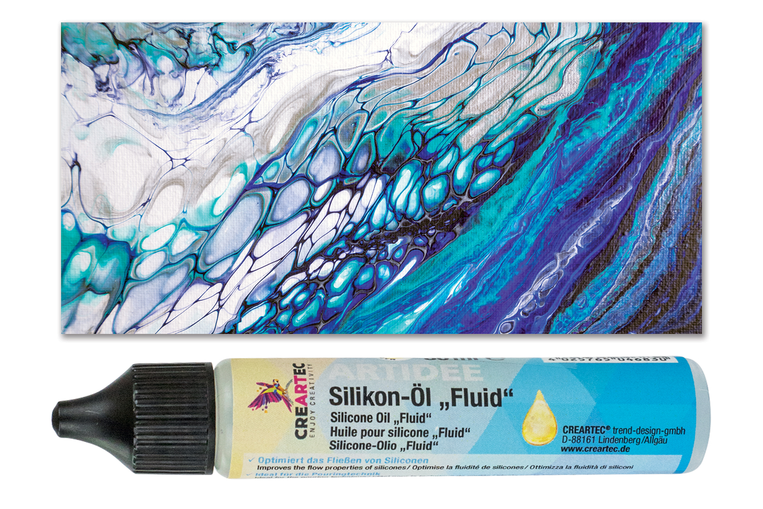 Aceite de silicona á utilizar en complemento del fluido medium Pouring Medium. El aceite de silicona permite crear celdas para dar un efecto de "pequeñas burbujas" en los cuadros de marbling.