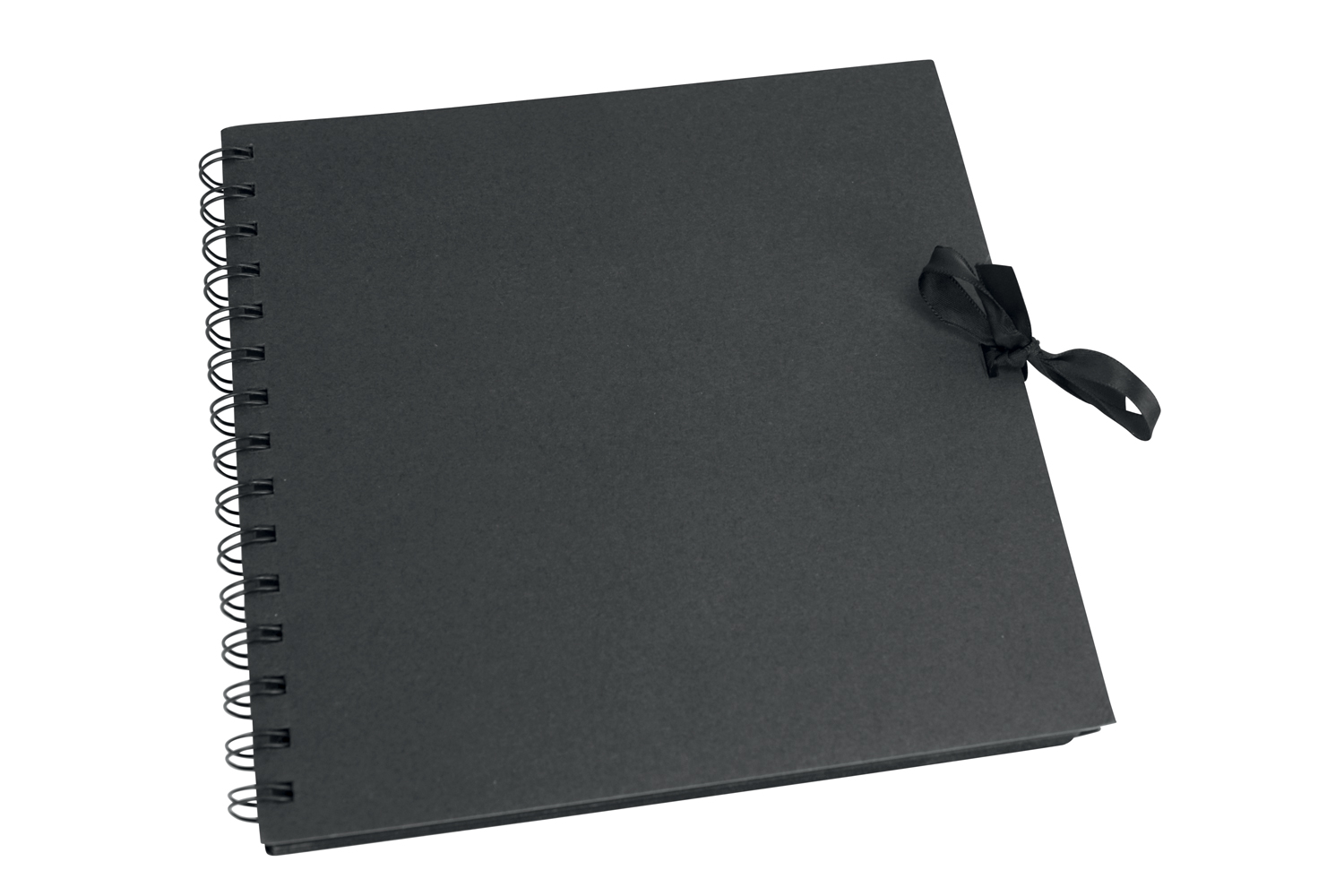 Álbum negro con hojas de papel rígidas negras para hacer páginas de scrapbooking, un libro de firmas o simplemente un álbum de fotos. Bonito álbum de lujo con una cinta negra para cerrarlo y páginas en espiral para trabajar fácilmente.