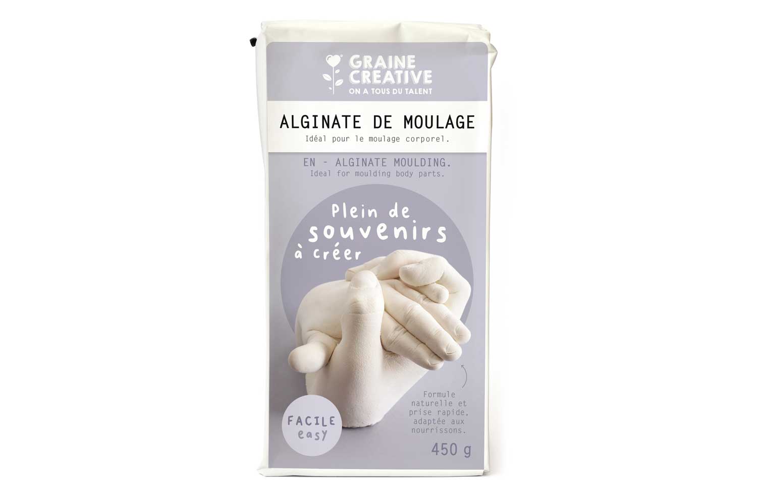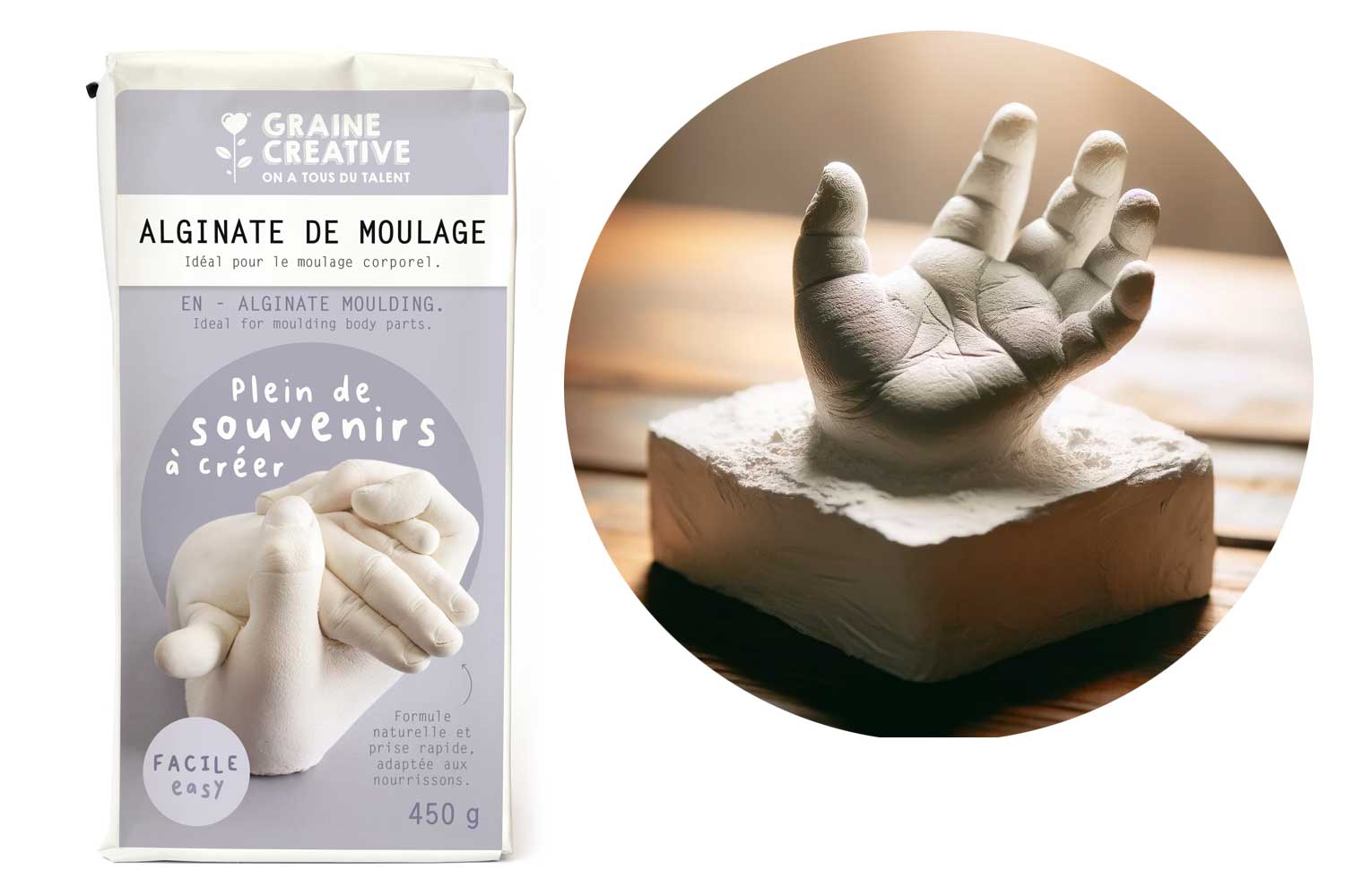 La algina de molde es un material utilizado para realizar moldes flexibles y precisos a partir de objetos tridimensionales. Se fabrica a partir de algas marinas y se utiliza a menudo en arte, manualidades y cine para crear réplicas detalladas de objetos o partes del cuerpo. Nuestra algina de secado rápido está especialmente estudiada para realizar impresiones de manos o pies de bebés ya que se solidificará rápidamente ! La algina de molde es apreciada por su facilidad de uso, su seguridad (es no tóxica) y su capacidad para capturar detalles finos. Sin embargo, presenta una durabilidad limitada (los moldes de algina generalmente no son reutilizables).