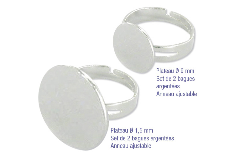 Anillo de metal plateado con bandeja para pegar una creación y anillo ajustable para adaptarse a todos los tamaños de dedos.