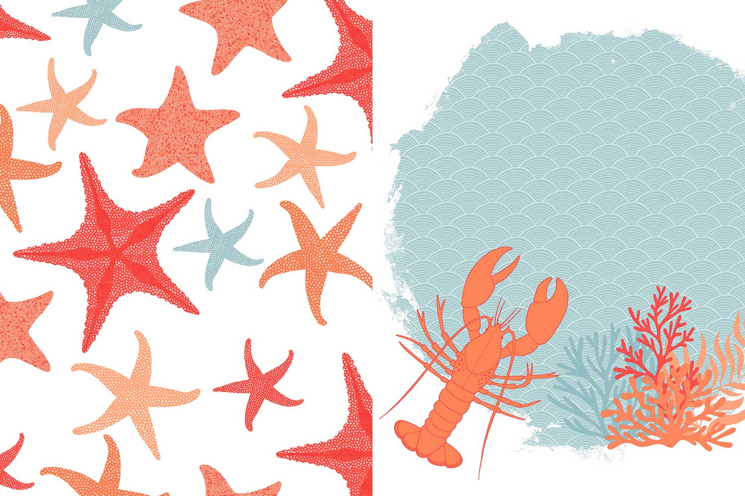 Tema Coral: tonos cálidos, motivos marinos, vegetación acuática, efectos texturizados