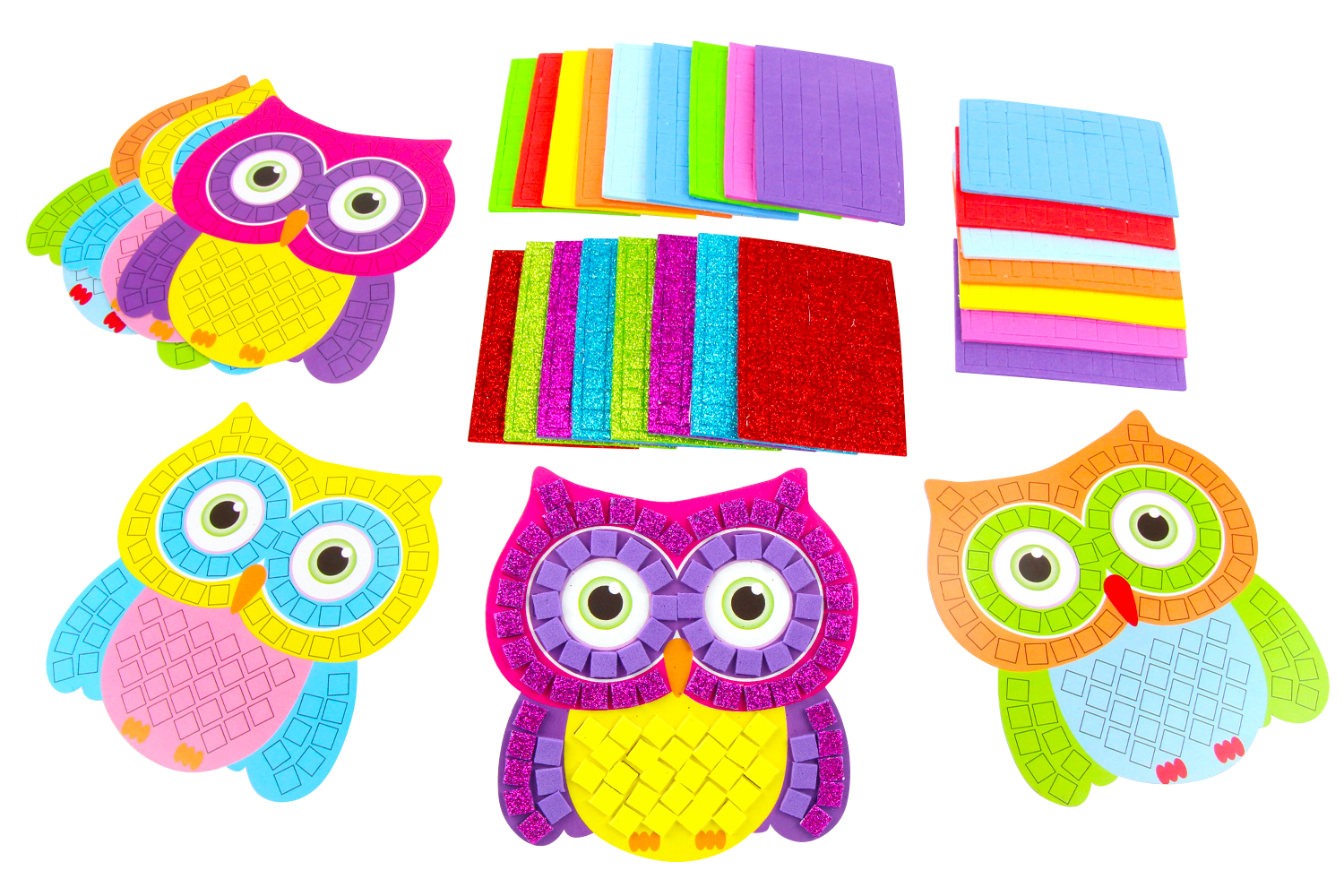 Kit completo de 6 formas búhos a decorar con mosaicos en caucho suave.