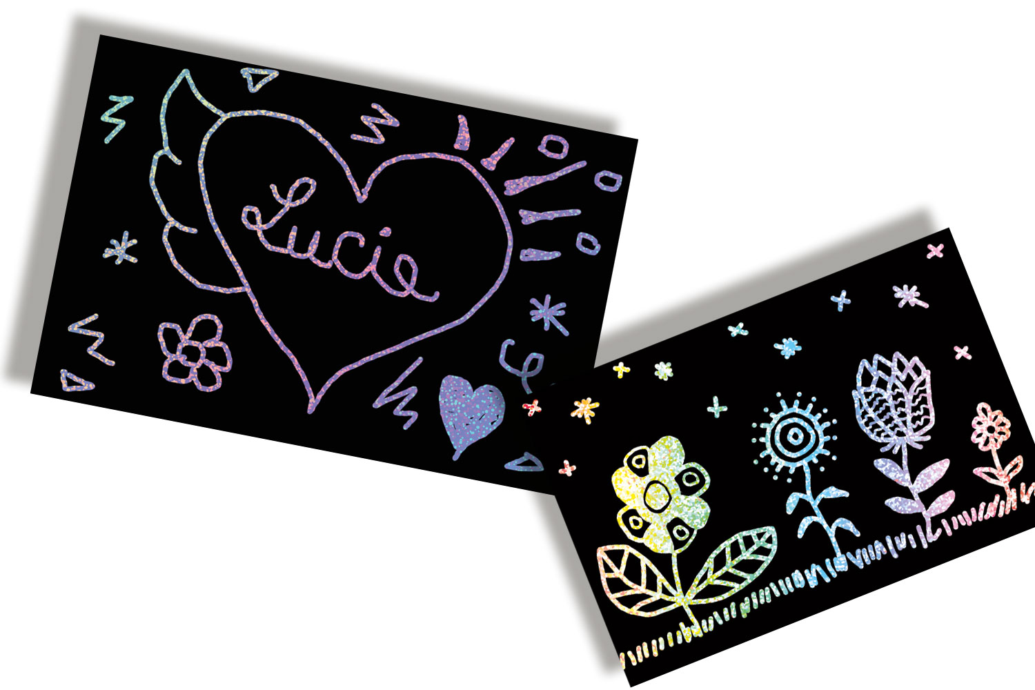 Cartas de rascar negras con fondo holográfico plateado. Rasca la cara negra para realizar tu propio dibujo o patrones haciendo aparecer la capa blanca ! Actividad lúdica para los pequeños como para los grandes niños !