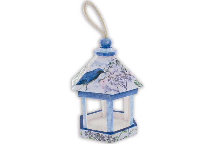 Comedero o casa de pájaros de madera a suspender en forma de quiosco.
