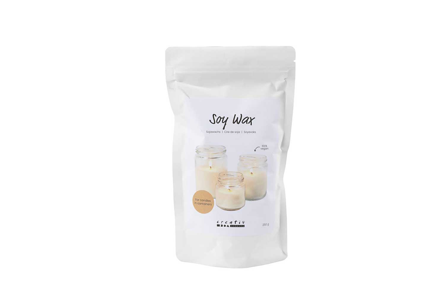 Cera de soja en copos, 100 % vegana. Perfecta para la fabricación de velas personalizadas, esta cera de soja en copos es completamente vegana. Se puede colorear y perfumar una vez fundida y antes de ser moldeada, ofreciendo así una gran flexibilidad para tus creaciones. La cera de soja retiene mejor los aceites esenciales y los perfumes, ofreciendo una difusión homogénea y duradera de los aromas.