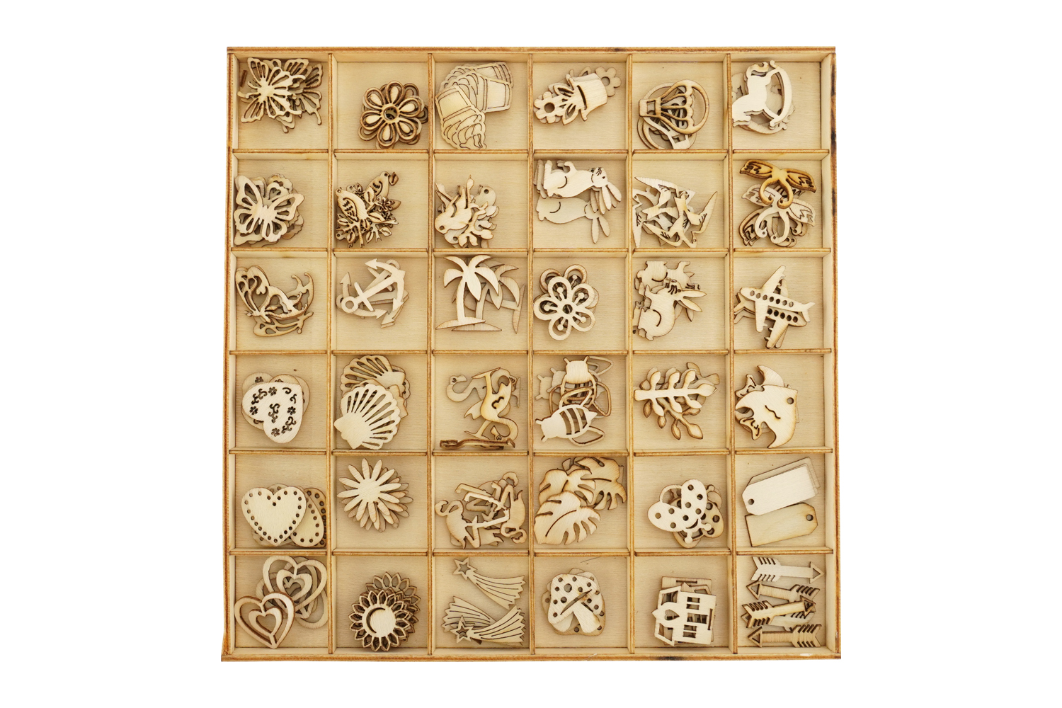 ¡Una gran caja llena de mini tesoros de madera! Con 36 figuras de madera (flores, animales, insectos, corazones, hojas…), este set completo es perfecto para decorar, personalizar o crear a la infinitud.