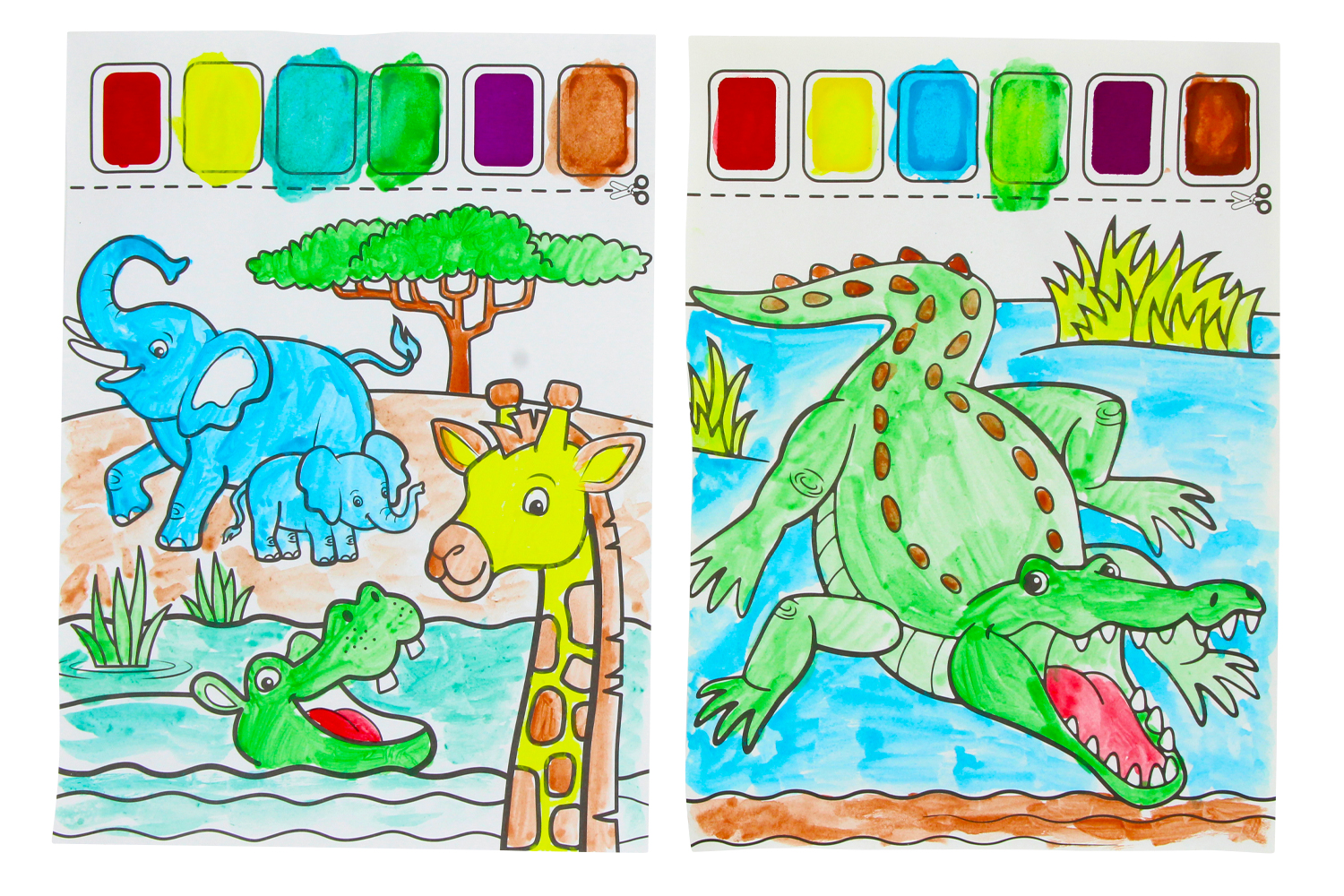 Set de 12 cuadros de animales con pastillas de pintura á agua integrada en cada hoja = ultra práctica para distribuir a los niños. Así cada niño podrá realizar su cuadro.