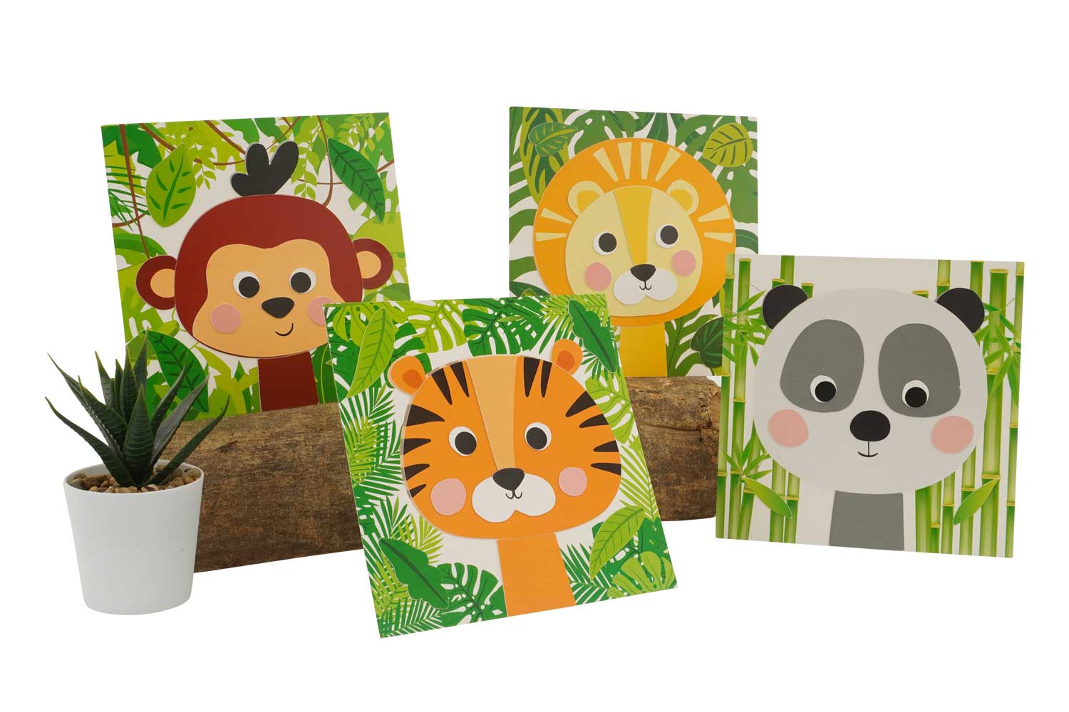 4 cuadros de animales en cartón grueso (león, panda, mono, tigre)