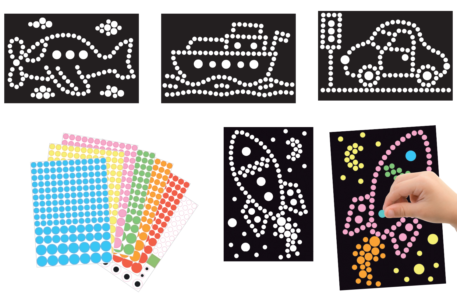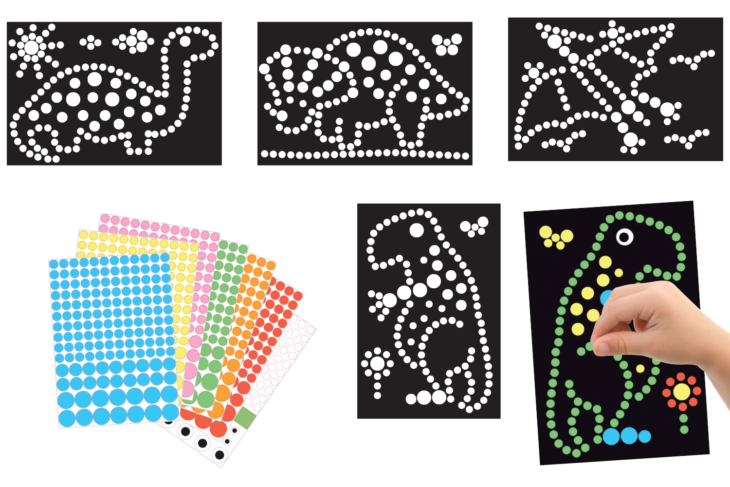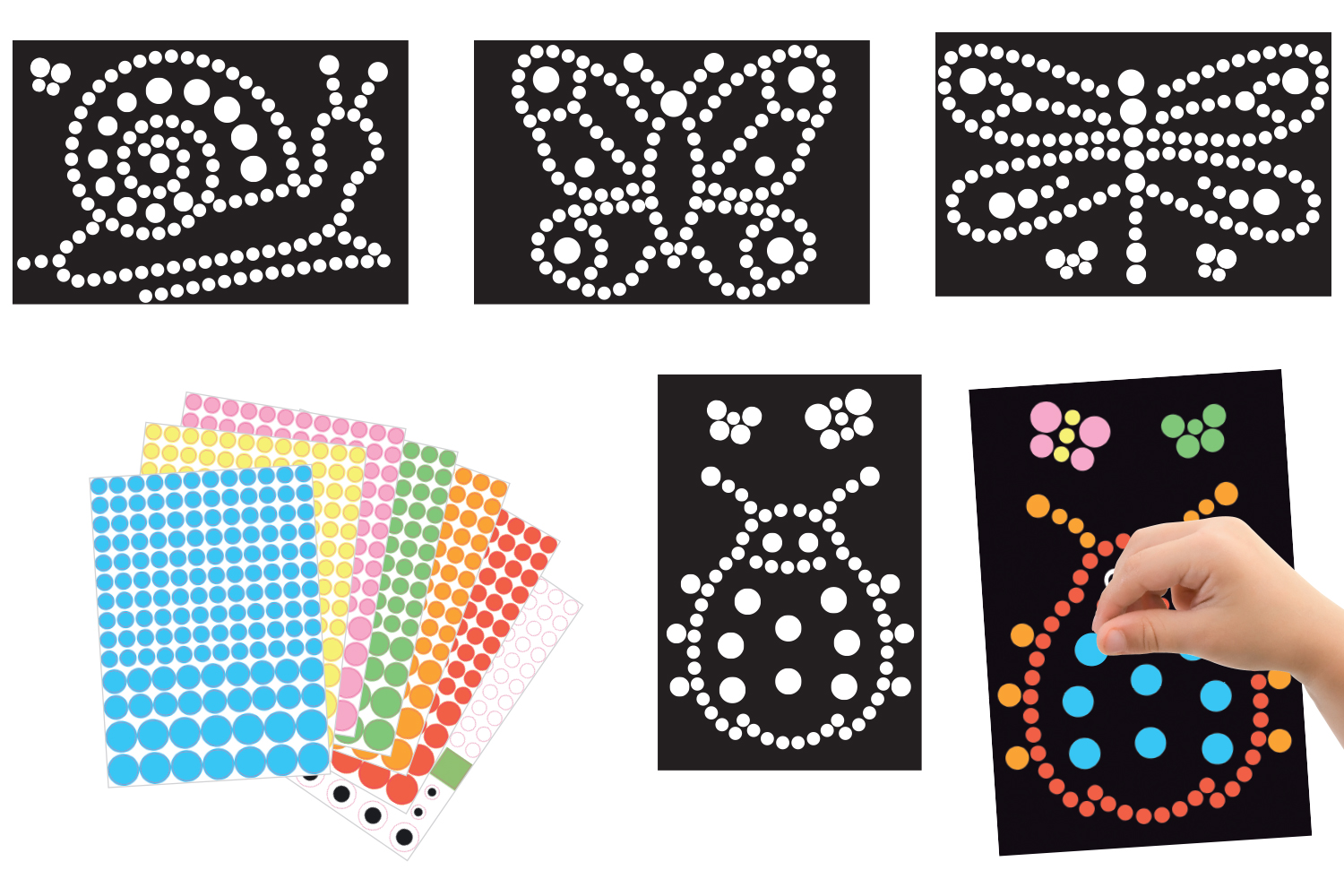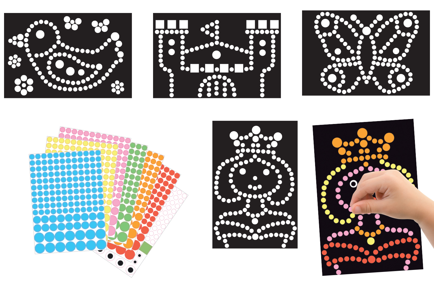 4 cuadros de cartón negro con dibujos en círculos blancos para cubrir con gommetas.