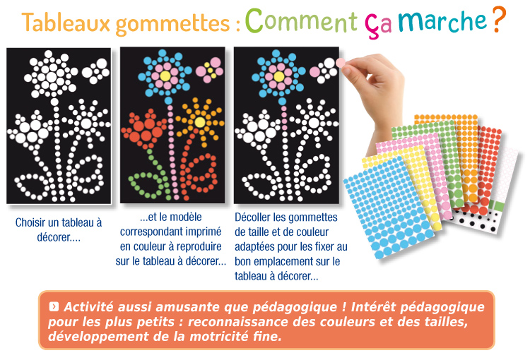 ¡Superb actividad para desarrollar la motricidad fina de los niños así como su reconocimiento de tamaños y colores! Así, los niños tendrán que colocar los gommetas sobre los puntos blancos del cuadro para crear una bella obra de arte colorida !