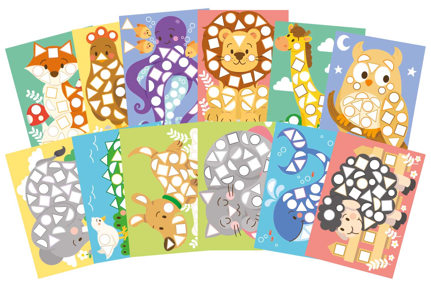 Conjunto de 12 cuadros de pegatinas "Animales lindos" perfecto para los niños, con sus adorables animales y sus colores suaves. Ofrecen una excelente oportunidad para desarrollar la destreza de los más pequeños, fomentar el aprendizaje de los colores y las formas, y desarrollar la capacidad de concentración.