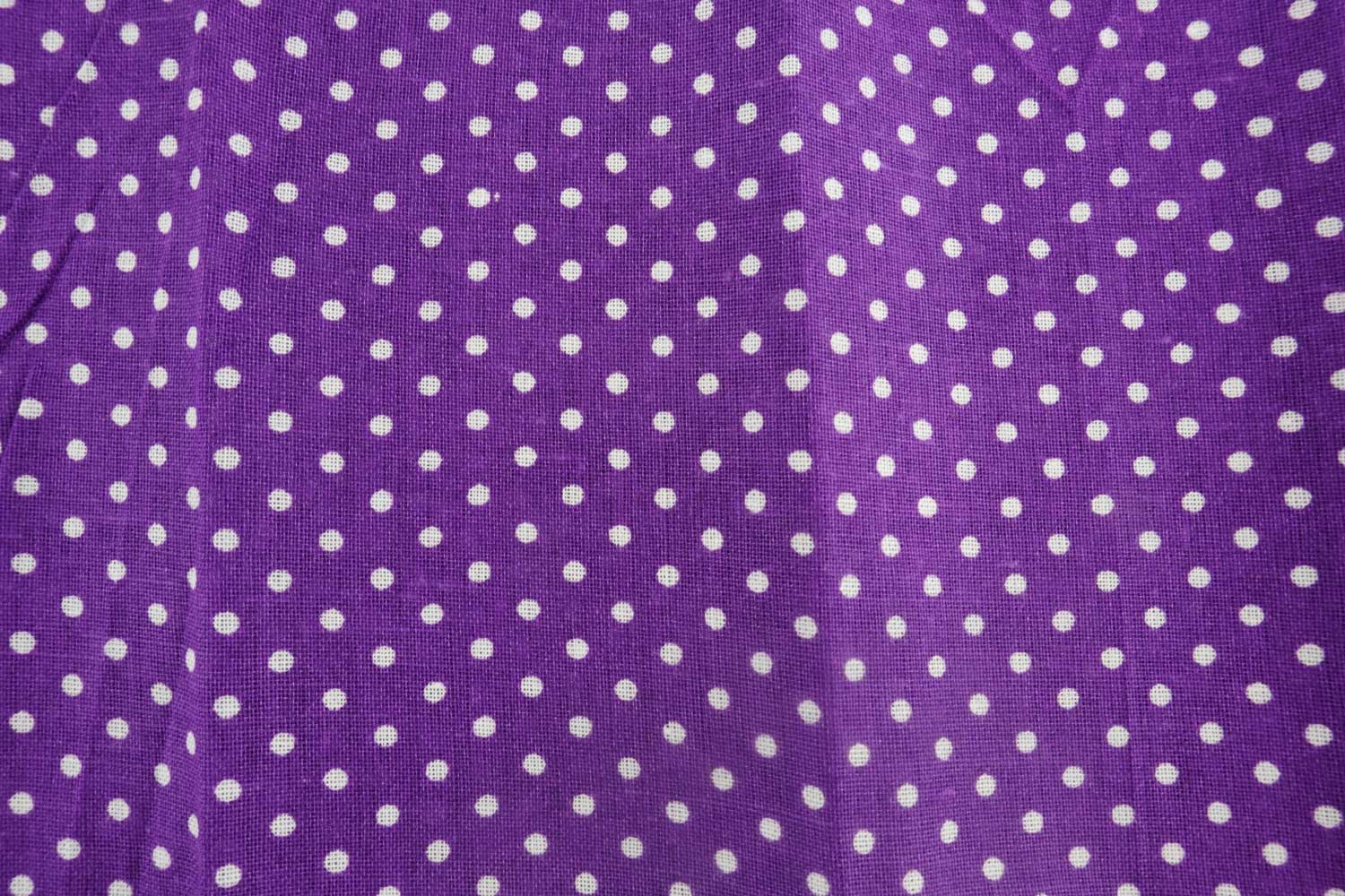 Gran cupón de tela de algodón para realizar todo tipo de trabajos de costura. Motivos de lunares blancos sobre fondo morado. Ideal para realizar magníficas piezas a coser, patchworks, bordados.