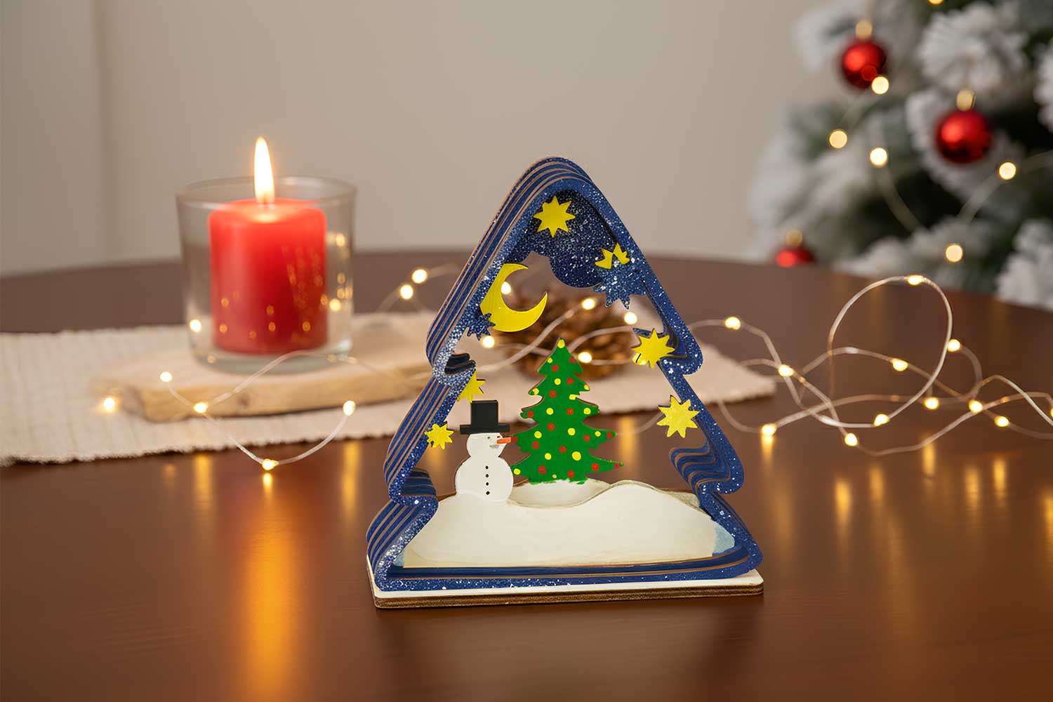 disfruta del ambiente festivo con esta escena de Navidad de madera para montar en forma de árbol. Este ingenioso kit creativo se compone de varias siluetas de madera que se superponen para crear un paisaje invernal encantador en relieve. Es el soporte ideal para un taller creativo en familia, permitiendo que cada uno personalice su propio cuento de Navidad antes de exhibirlo con orgullo en la chimenea.