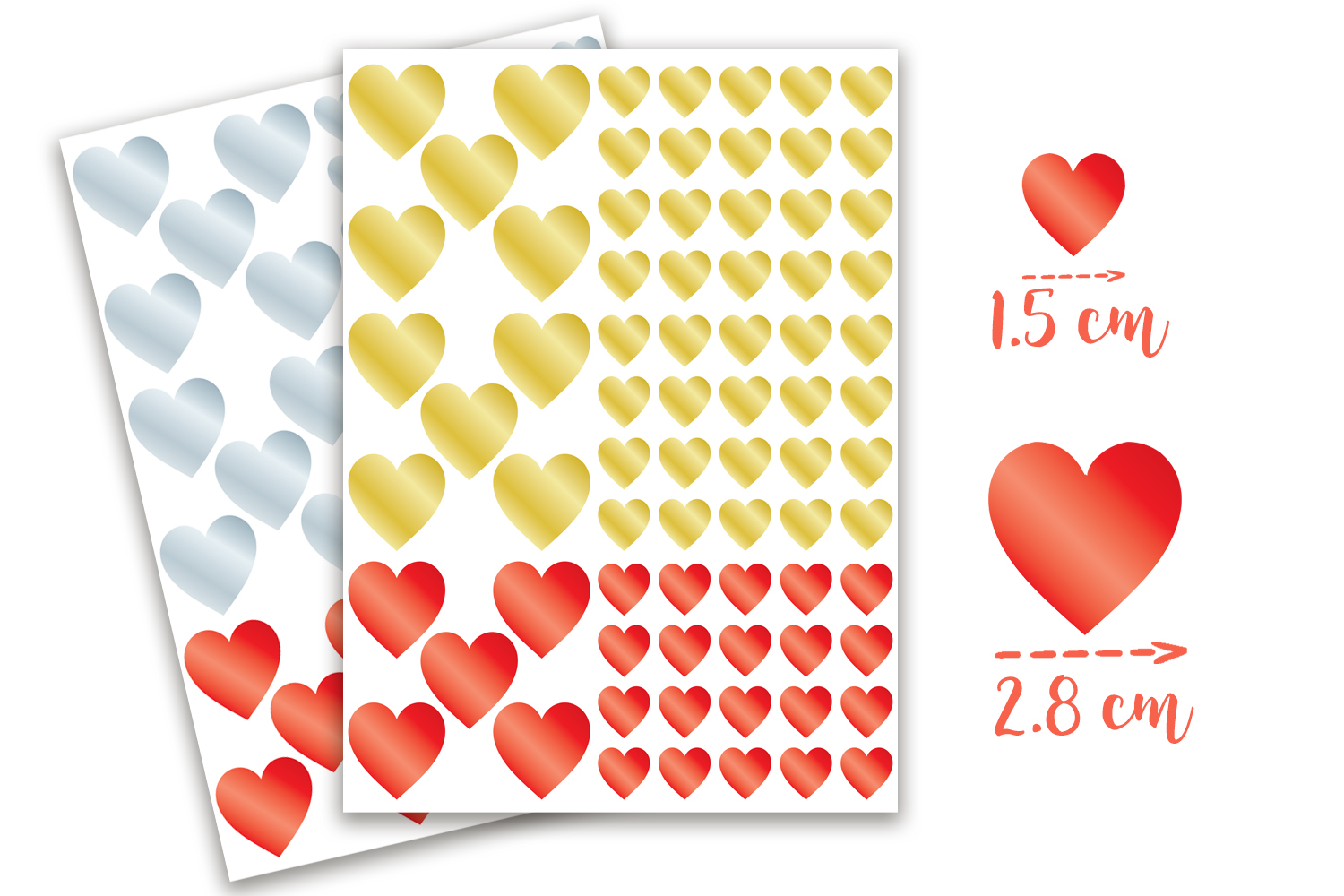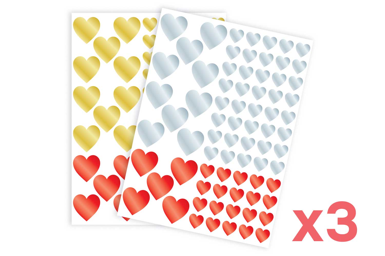 Gomets 10 DOIGTS reposicionables en forma de corazón. Planchas de 75 gomets cada una, declinados en 3 colores metalizados: rojo, oro y plata.