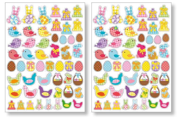 Gomets 10 DOIGTS en formas variadas con el tema de Pascua con impresión de cuadros pequeños. Formas tradicionales variadas: huevos, conejos, gallinas, cestas, campanas y pollitos.