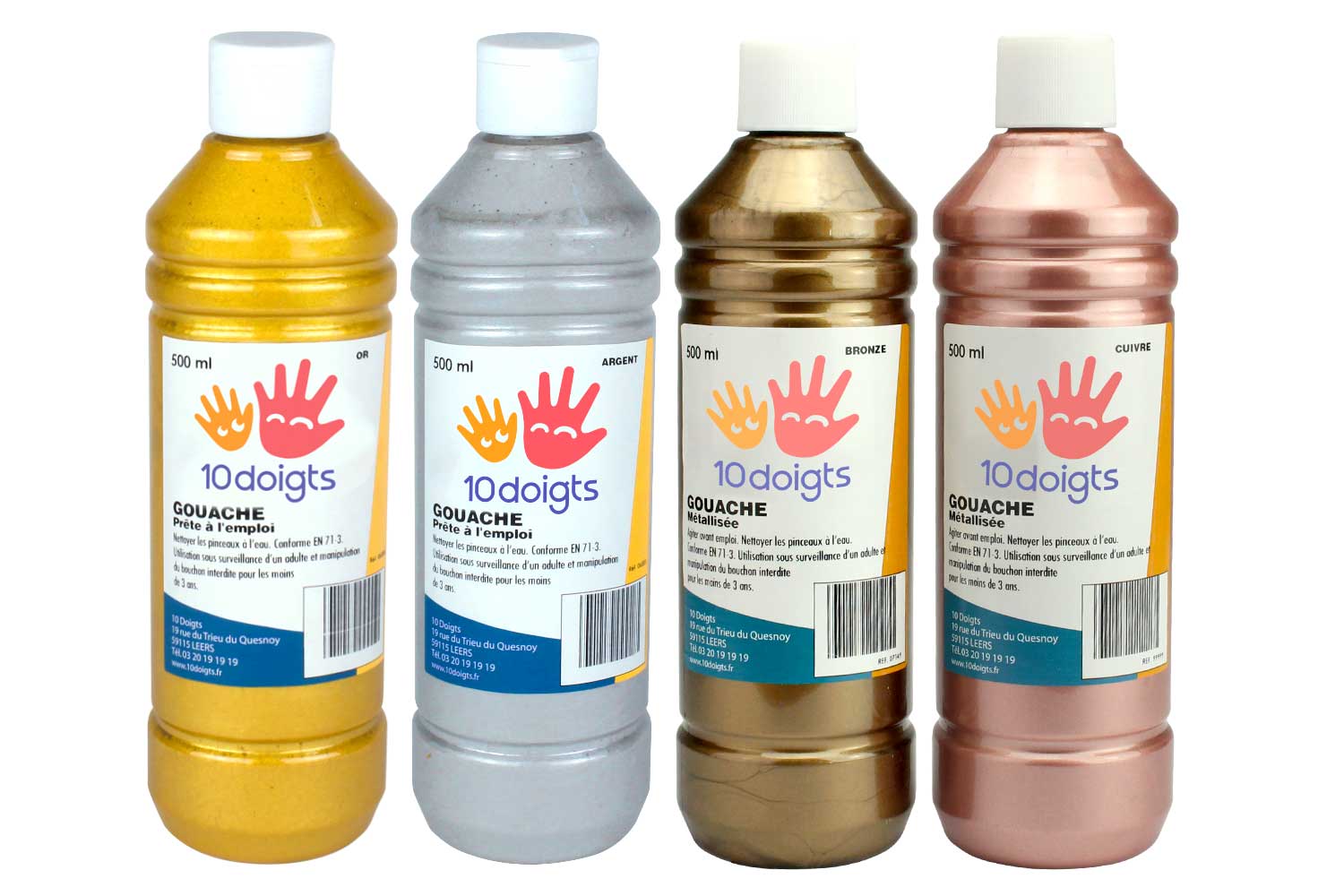 Muy bellas gouaches disponibles en 4 colores metalizados (oro, plata, bronce, cobre). Botella de 500 ml económica, para pintar sobre madera, cartón, papel, yeso... Realiza hermosos efectos nacarados y metalizados para embellecer tus creaciones de fiestas.