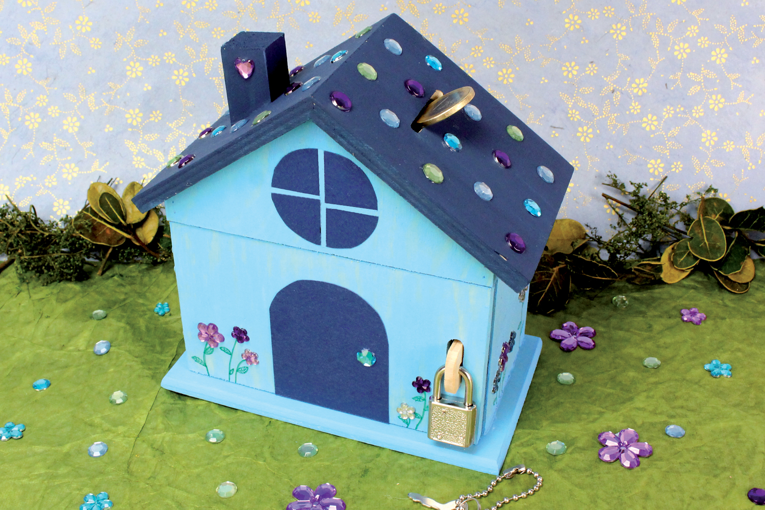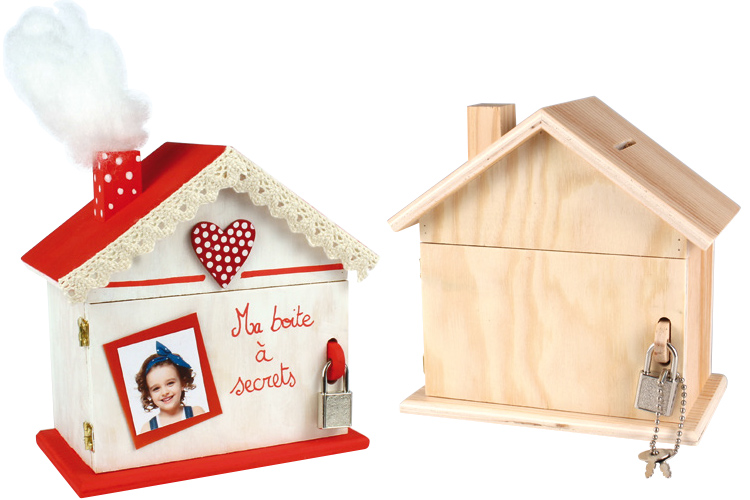 Hucha de madera natural en forma de casa con cerradura y llaves.