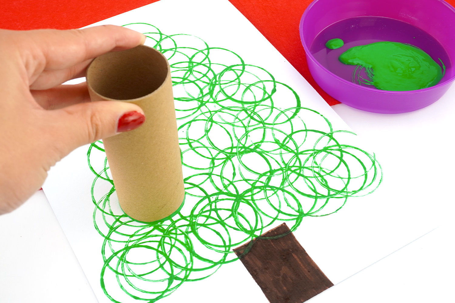 Estampar un rollo de cartón en pintura verde, luego estampar sobre la hoja blanca para crear la forma de árbol de Navidad.