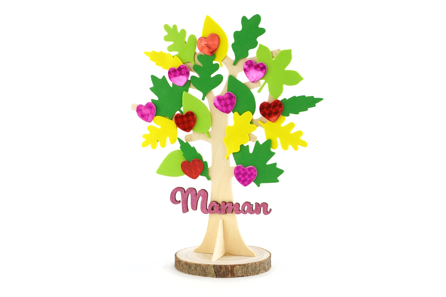 Aquí hay una actividad manual tan bonita como adorable: un pequeño árbol de madera decorado con amor por los niños para su mamá. Con la ayuda de adhesivos en forma de hojas y corazones, harán florecer un árbol lleno de ternura. Una palabra "Mamá" en madera, coloreada con un marcador brillante, y un tronco de madera natural completarán esta creación de la cual los pequeños artistas estarán orgullosos de regalar !