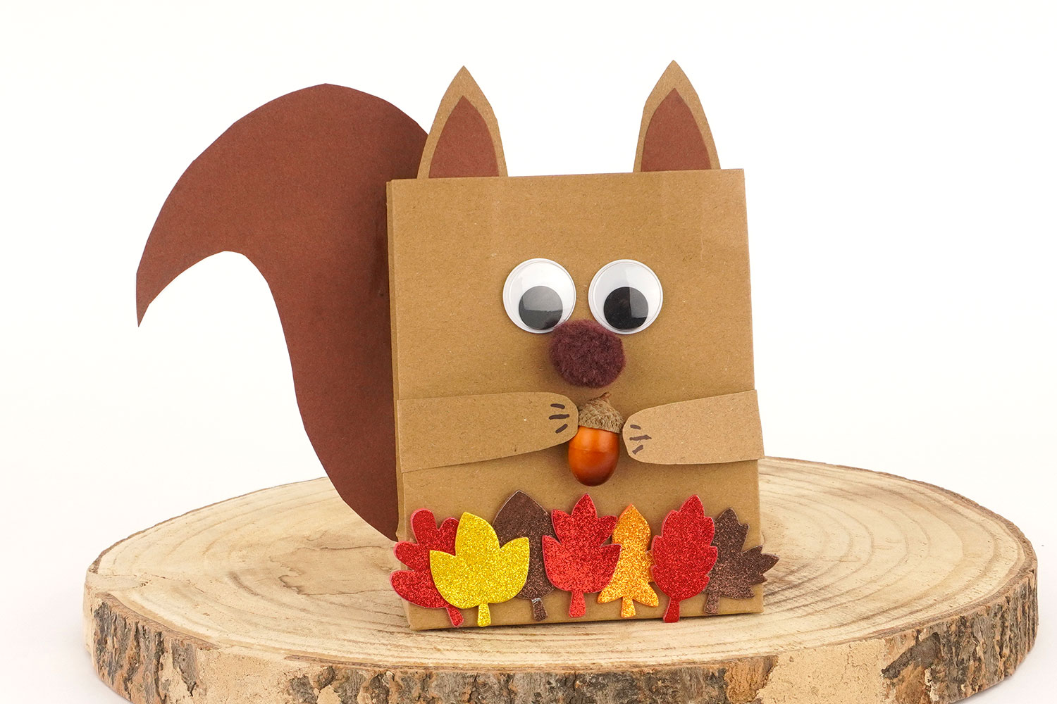 Para una actividad de manualidades de otoño simple y divertida, crea una adorable ardilla a partir de una bolsa de papel kraft, de papel de colores, de hojas brillantes y de una pequeña bellota decorativa.