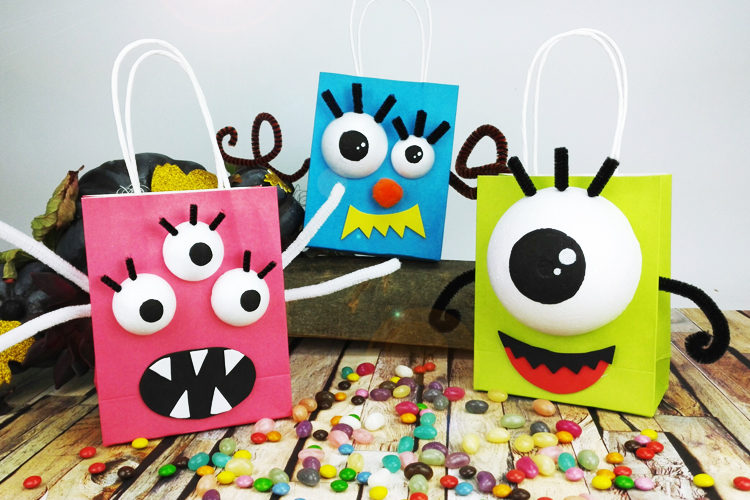 ¡Una actividad manual para Halloween que consiste en transformar pequeñas bolsas de papel kraft en monstruos graciosos con grandes ojos saltones! Además de divertirse haciendo los monstruos, ¡los niños también podrán usar las bolsas la noche de Halloween para recolectar dulces!