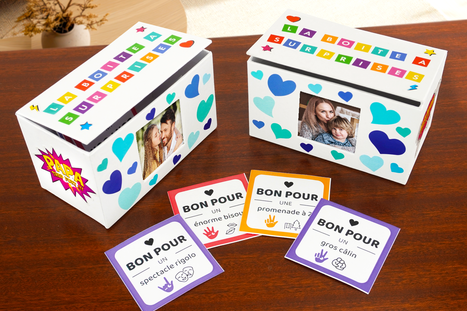 Con esta actividad para el día de los padres, los niños podrán decorar una bonita caja personalizable con gomets y una bonita foto. Dentro, deslizarán pequeños "vales para" ofrecer: un abrazo, una merienda, un paseo, un espectáculo... Una forma simple y conmovedora de hacer feliz a sus padres con pequeños detalles del día a día.