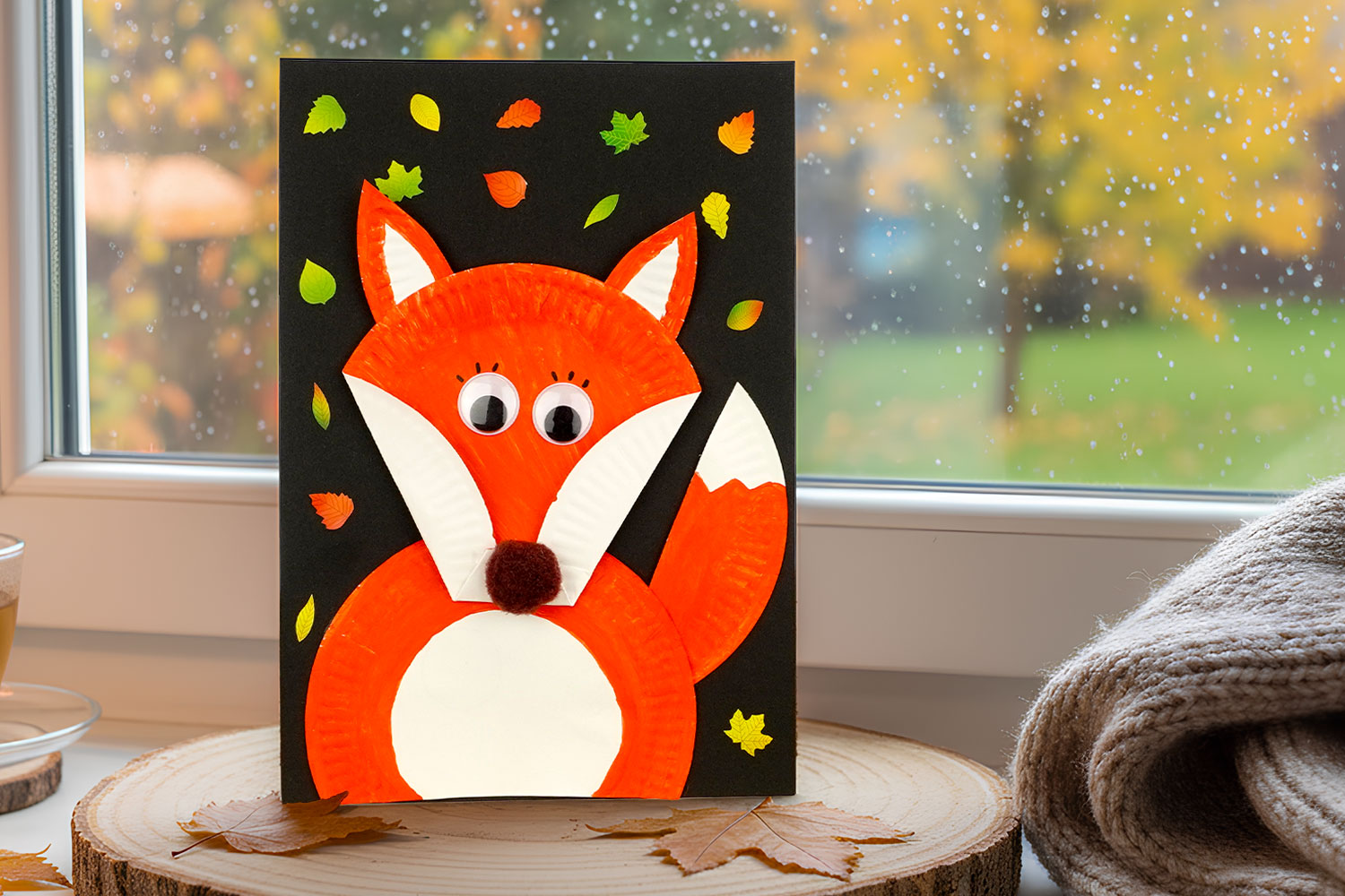 Para terminar, decora el fondo negro con gomets en forma de hojas de otoño para crear un bonito ambiente otoñal alrededor del zorro.