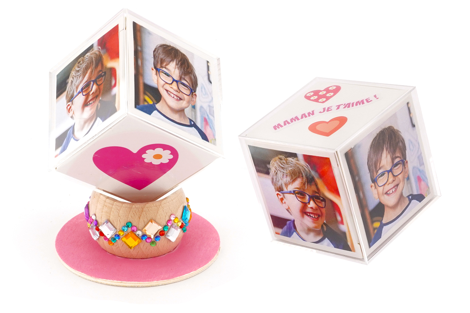 Los niños podrán expresar todo su amor y su creatividad gracias a esta actividad única y emotiva. Decorarán un cubo de cartón añadiendo fotos, dibujos o tiernos mensajes de amor, antes de deslizarlo en un elegante cubo de acrílico. Todo será sublimado por una base decorativa compuesta por un círculo de madera, un círculo de servilleta y brillantes strass, para un acabado perfecto.