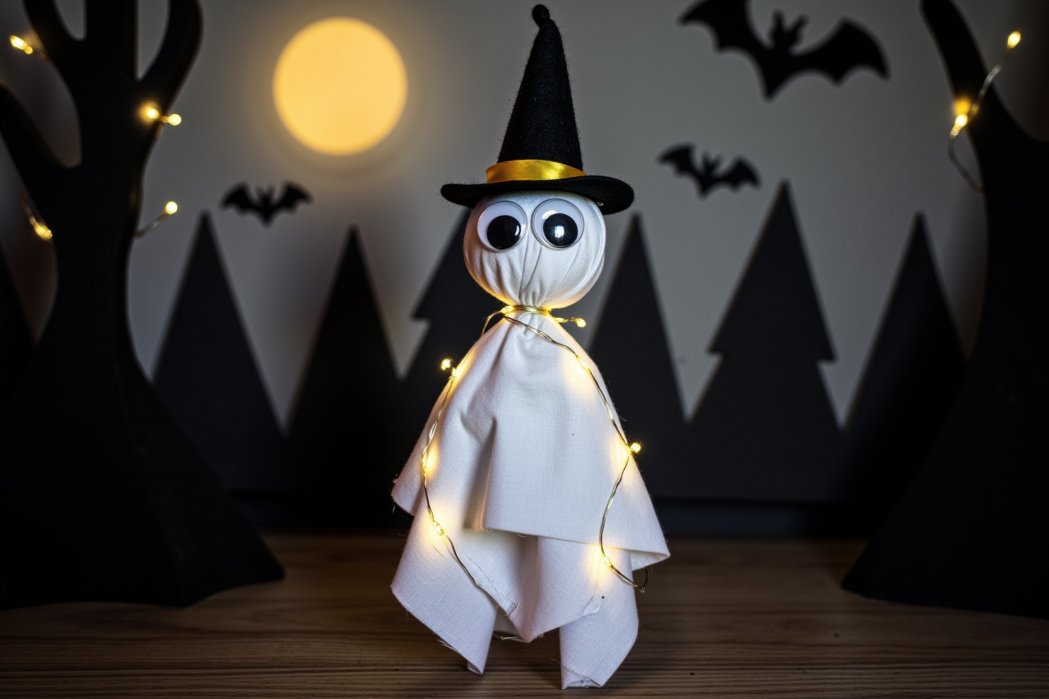 Colocar la varilla en la base de madera y luego enrollar la guirnalda LED alrededor del fantasma.