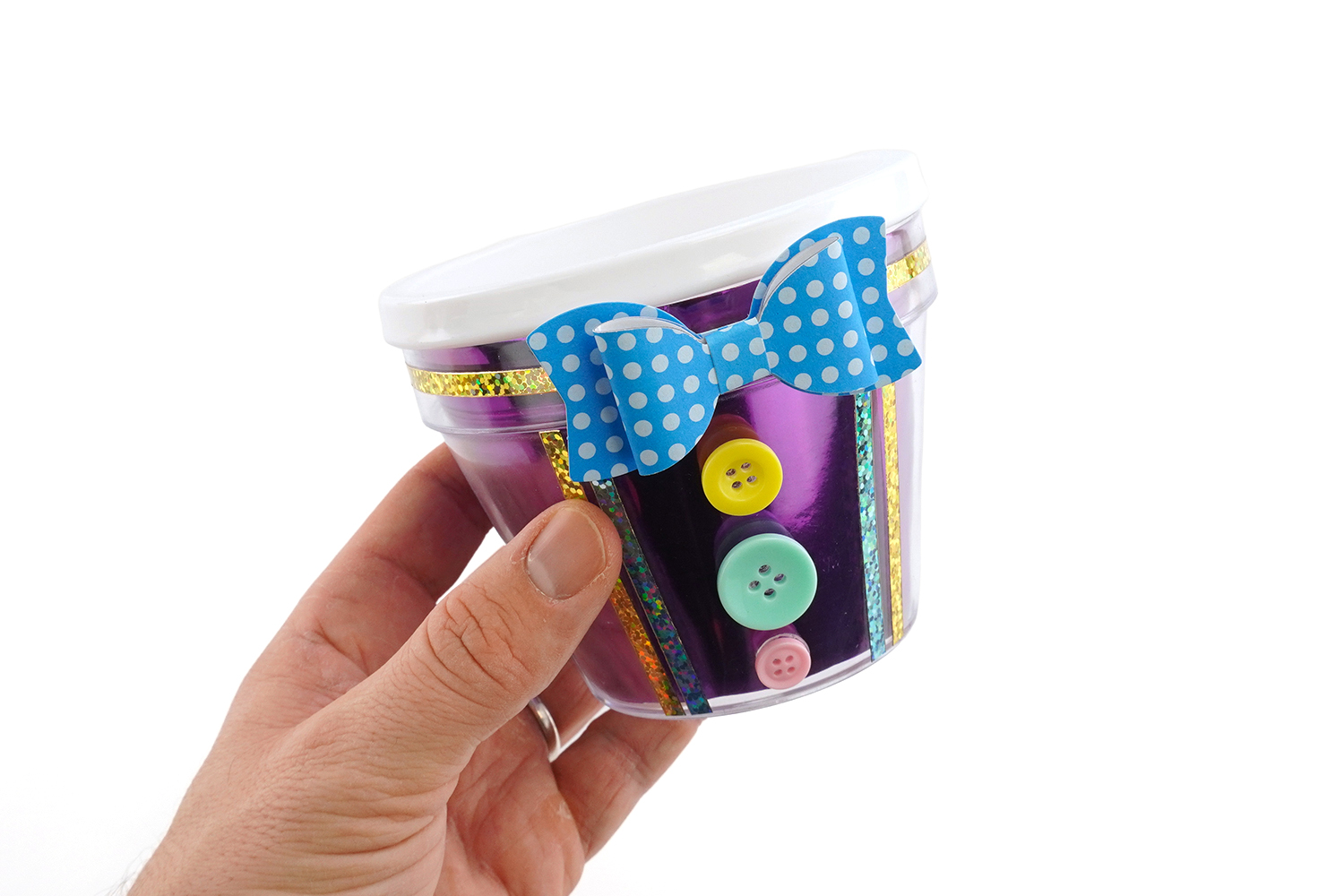 Decorar el frasco con una pegatina de moño y botones de colores para crear una bonita camisa.