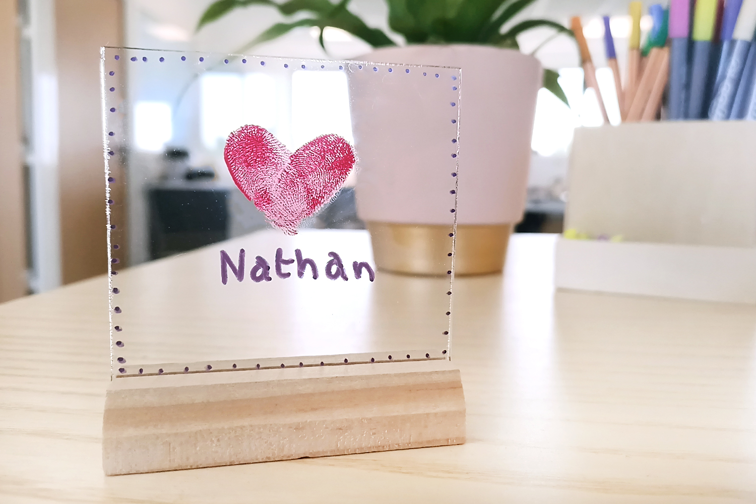 En esta actividad fácil para la fiesta de las madres o la fiesta de los padres, vamos a fabricar pequeños soportes de plexiglás personalizados utilizando las huellas dactilares de los niños y pintura.