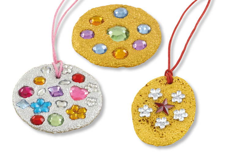 Aplanar la bola para formar un medallón o cualquier otra forma de su elección. Con una punta (bolígrafo, lápiz...), hacer un pequeño agujero para poder pasar su cordón una vez que la pasta esté seca. Introducir ligeramente los strass en la pasta. Dejar secar 24 horas.
