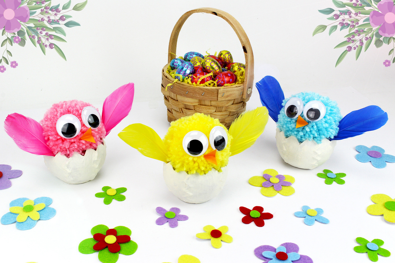 Una actividad de Pascua divertida para enseñar a los niños a hacer un pajarito pom pom con lana. Para acentuar el lado irresistible de estos pajaritos tan suaves, ¡también les haremos una bonita concha!