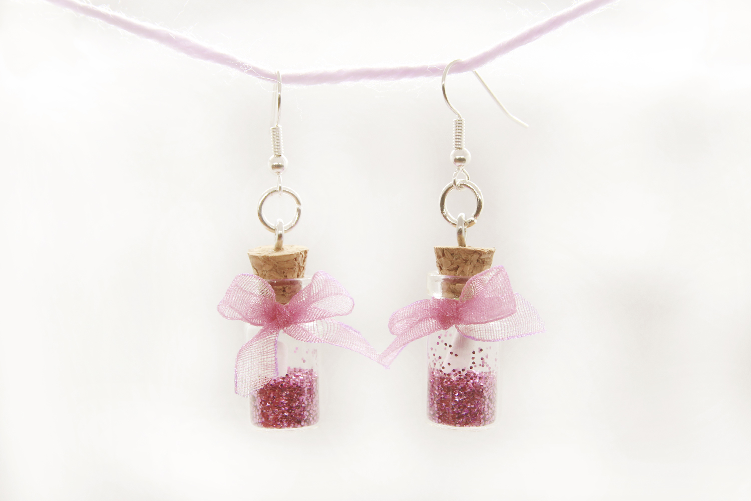 ¡Confecciona pendientes con pequeñas botellas de vidrio. Rápido y fácil de realizar con un poco de purpurina y un poco de cinta Organza!