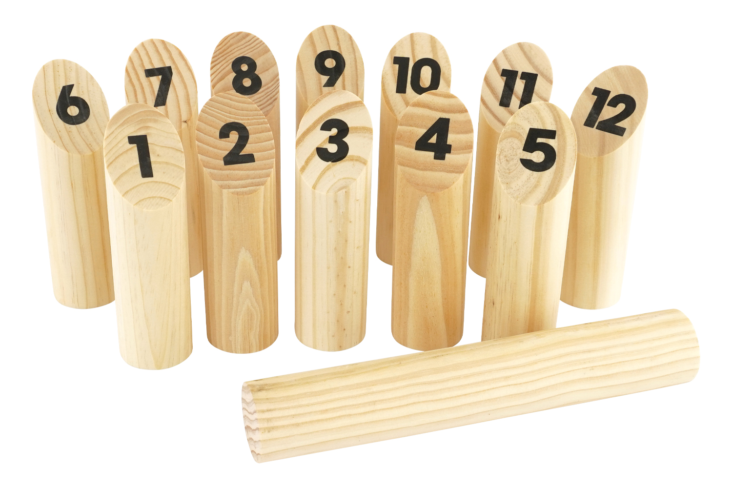 - Contenido del set : 12 bolos de madera numerados del 1 al 12 y un robusto palo de lanzamiento.
