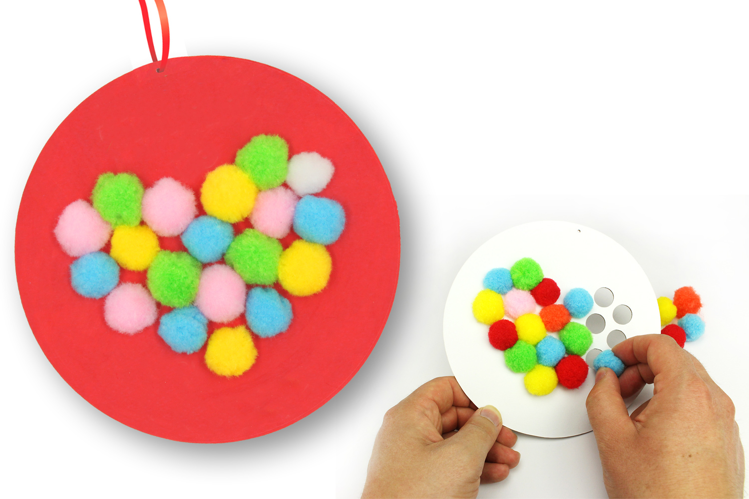 Una actividad 2 en 1 que permitirá a los niños pequeños desarrollar su motricidad fina y su creatividad. La primera parte de la actividad consiste en colorear los discos con marcadores o lápices de colores. La segunda parte consiste en tapar los agujeros con pompones de colores muy suaves para dar volumen a la creación, y ello mientras se desarrolla la motricidad y el tacto.