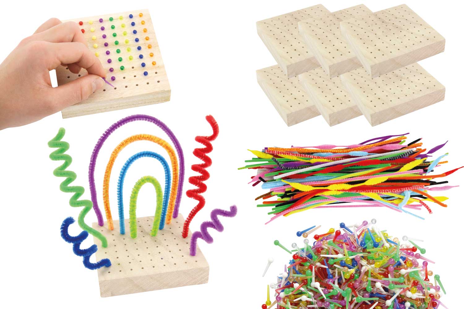 Kit de actividades para ejercer la motricidad fina (manos, dedos). Compuesto de 6 placas cuadradas de madera huecas, de hilos limpiapipas y de alfileres de colores para plantar.