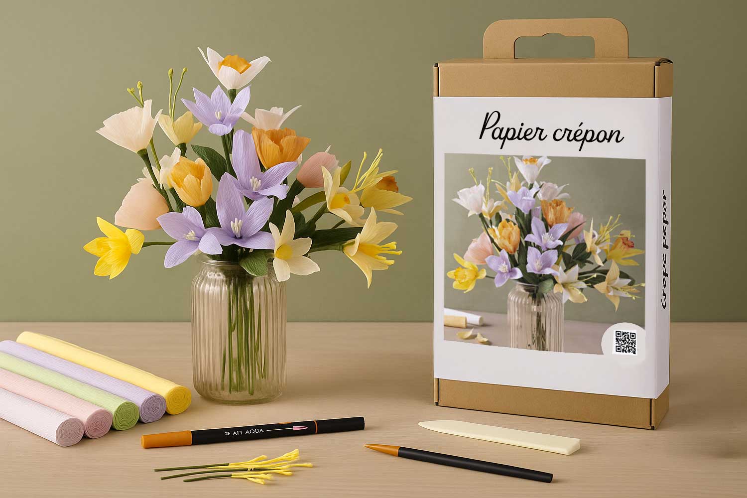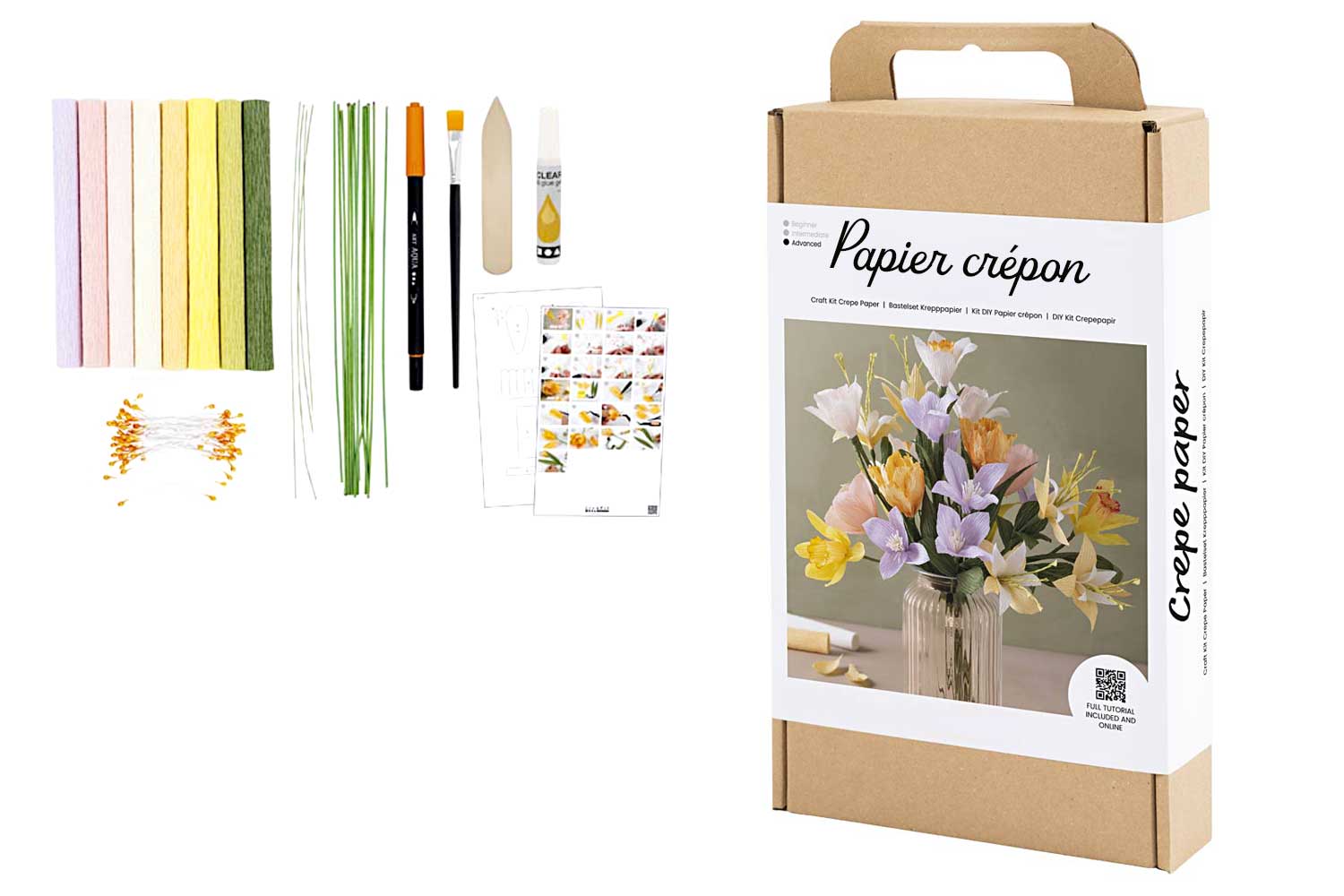 Este kit de flores de papel crepé contiene todo lo necesario para realizar un bouquet delicado en tonos pastel. Perfecto para una decoración primaveral o una mesa de Pascua, este kit te permite confeccionar un hermoso bouquet hecho a mano, duradero y sin mantenimiento. ¡Una alternativa elegante y ecológica a las flores frescas !