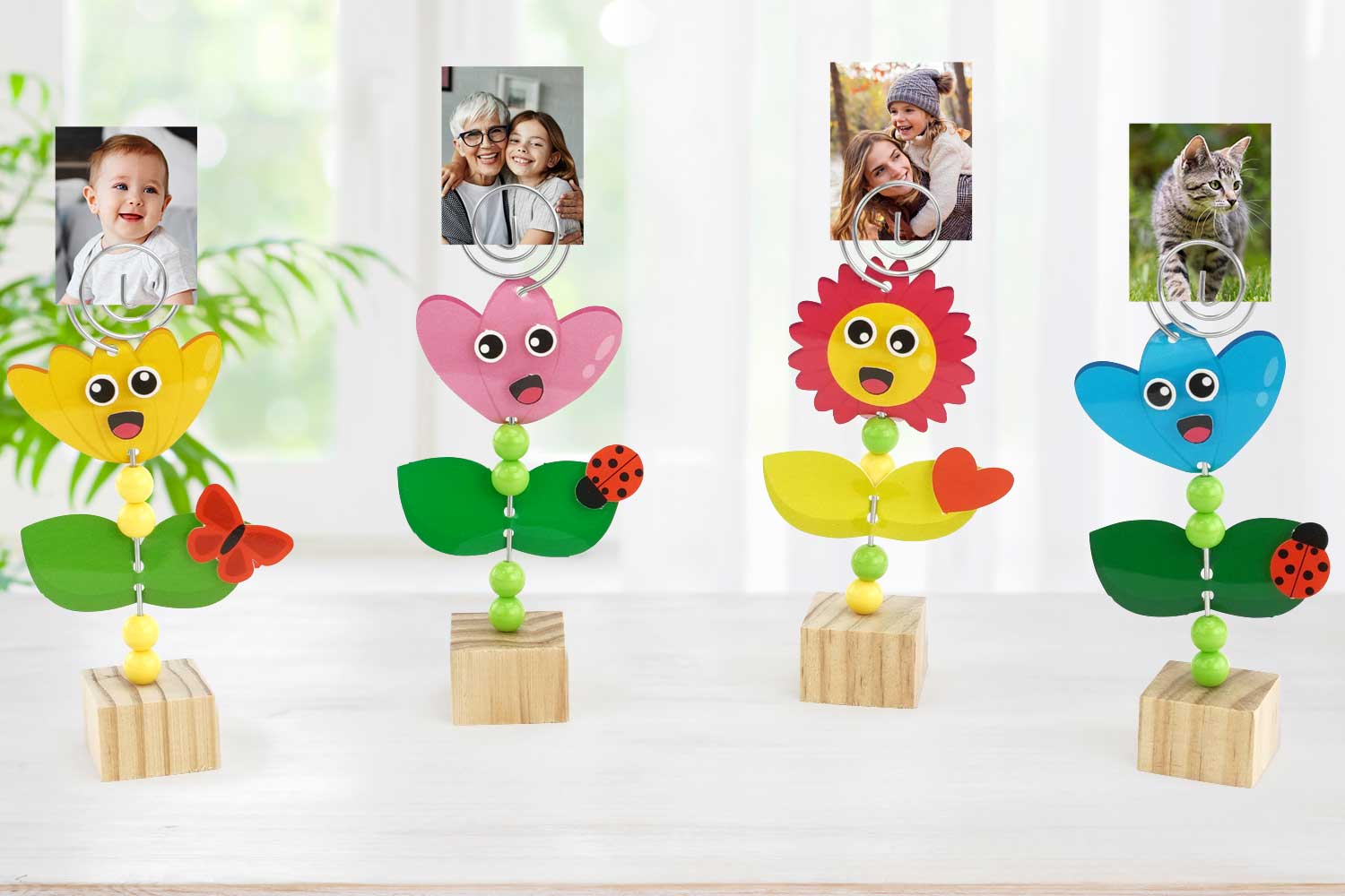 Aquí hay un kit creativo para realizar 6 adorables porta-fotos en forma de flores. Este kit completo incluye bases de madera, perlas y formas de cartón rígido para dar vida a estas lindas creaciones. Cada una de estas flores coloridas servirá de soporte para resaltar tus fotos más bellas.