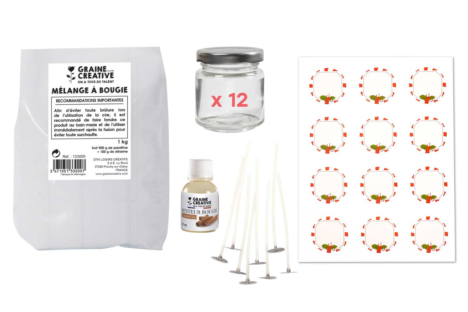 Kit todo incluido para fabricar velas aromáticas de Canela para las fiestas de Navidad. En este kit, encontrarás cera, perfume, pequeños frascos de vidrio y mechas para velas para crear un regalo original para ofrecer, entregado con una hoja de etiquetas impresas para personalizar cada creación !
