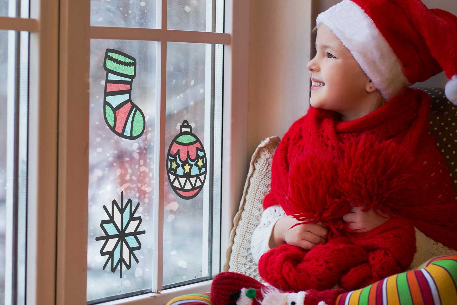 Kit de formas de Navidad en papel grueso negro troquelado, con 5 hojas de papel de seda colorido. Decora cada forma pegando el papel de seda en las partes negras, y luego expónlo en una ventana para dejar pasar la luz a través del papel y crear un efecto de vitrales.