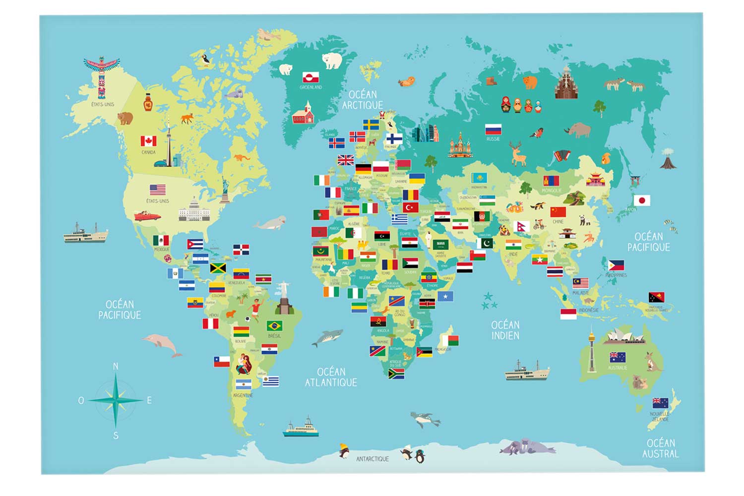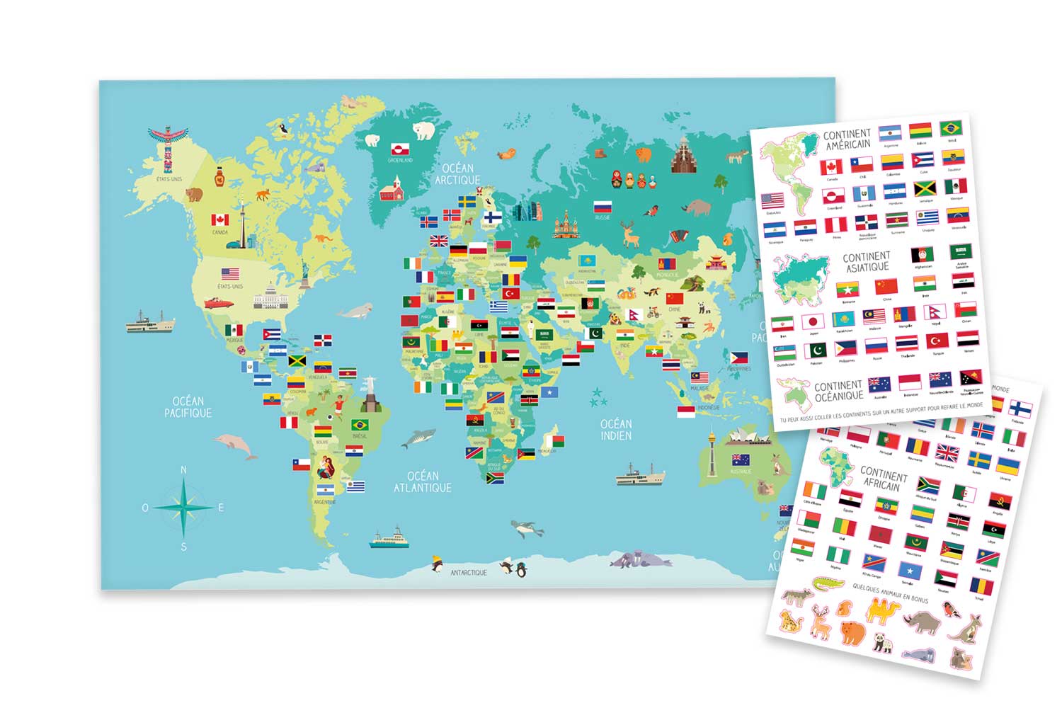 Gran mapa del mundo en papel brillante con sus 2 planchas de gomets. Los niños aprenderán mientras se divierten sobre los países y los continentes del mundo con este conjunto de mapa + gomets.