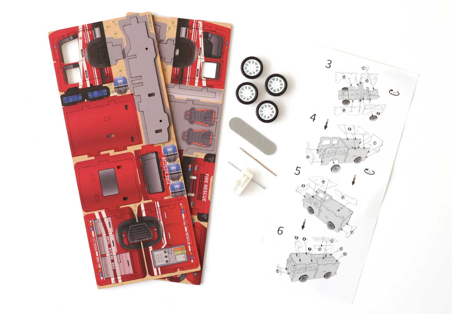 Cada pieza está cuidadosamente precortada en madera impresa para ofrecer un acabado realista y de calidad. El ensamblaje se realiza sin pegamento ni herramientas complejas: los elementos encajan fácilmente, lo que hace que la actividad sea divertida y accesible. Una vez montado, ¡solo hay que retroceder el camión para verlo avanzar por sí solo!