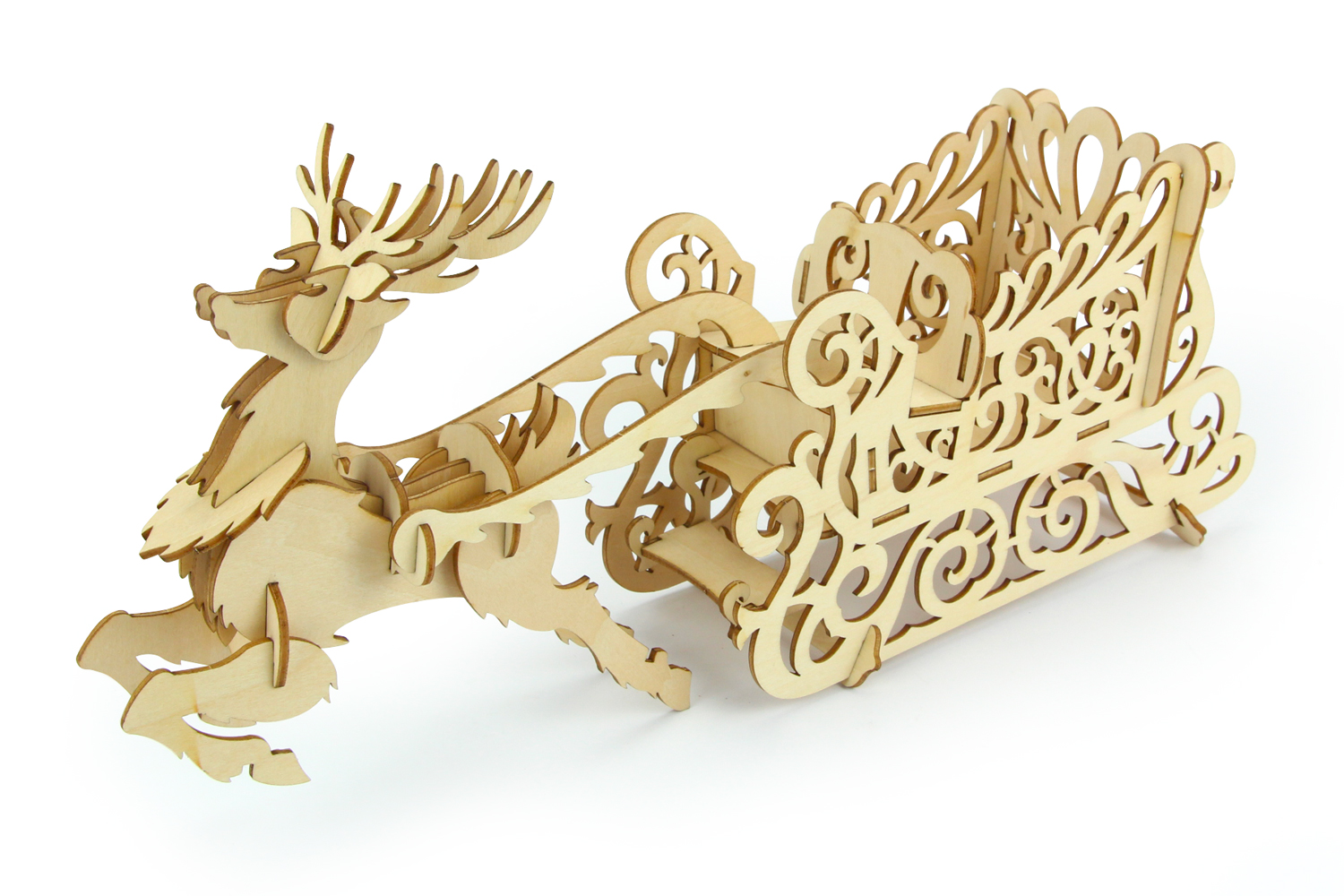 Maqueta de trineo y reno de madera para montar, con instrucciones explicativas. Una creación que requiere paciencia y minuciosidad que recomendamos a adultos o adolescentes.