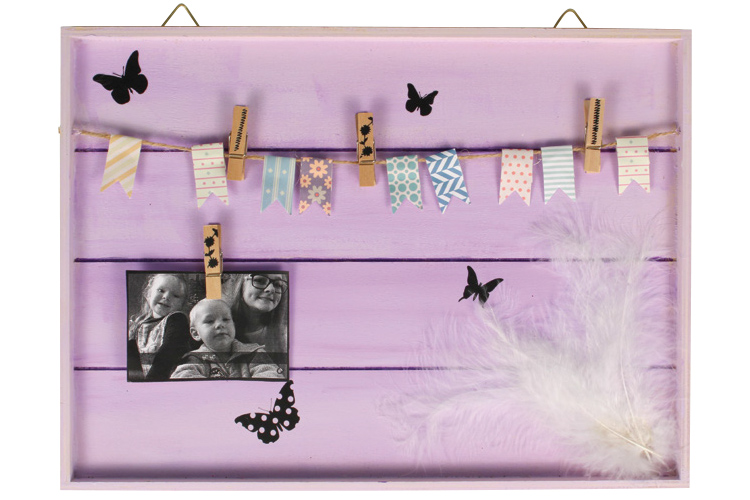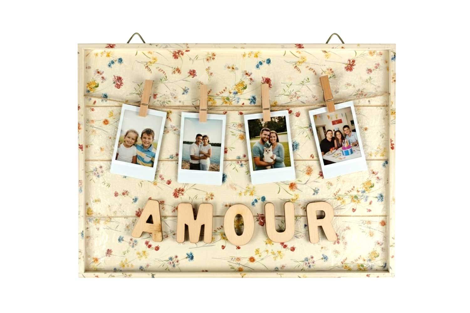 Decora el fondo y luego cuelga tus fotos con las pinzas para componer tu panel. Gracias a sus 2 ganchos metálicos en la parte posterior, podrás colgar fácilmente tu marco en la pared.