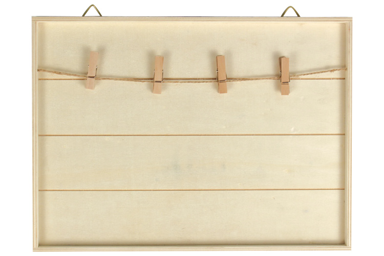Placa de madera con cordel de algodón y 4 pinzas de madera natural para crear un panel original y personalizado.