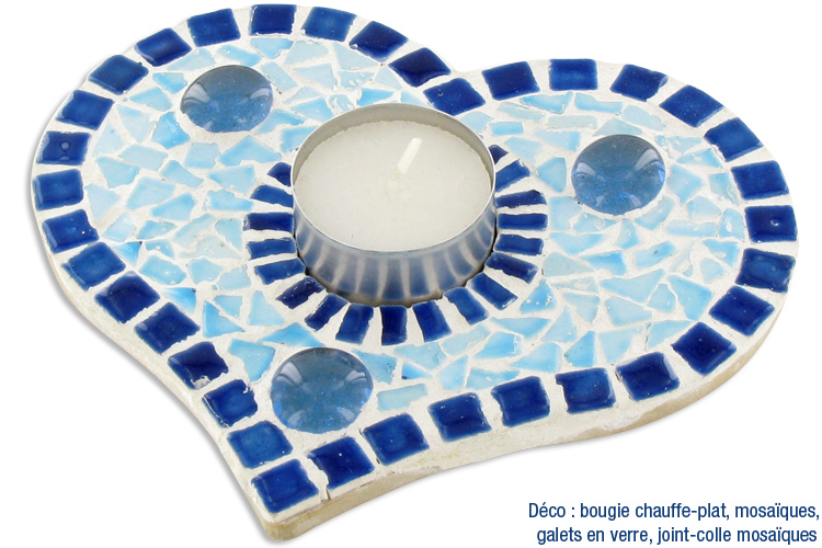 Para decorar un objeto de madera, plástico o vidrio, solo tiene que seguir estos 2 pasos: Pegue los mosaicos sobre su soporte dejando un espacio de aproximadamente 3 mm entre ellos, y una vez que el pegamento esté seco, cubra su realización con una pasta para juntas. Puede usar una pasta lista para usar, o preparar usted mismo su junta para mosaicos con un polvo para preparar y un poco de agua (encuentre estos productos en la sección herramientas y accesorios mosaicos). Limpie el exceso de junta con una esponja húmeda.