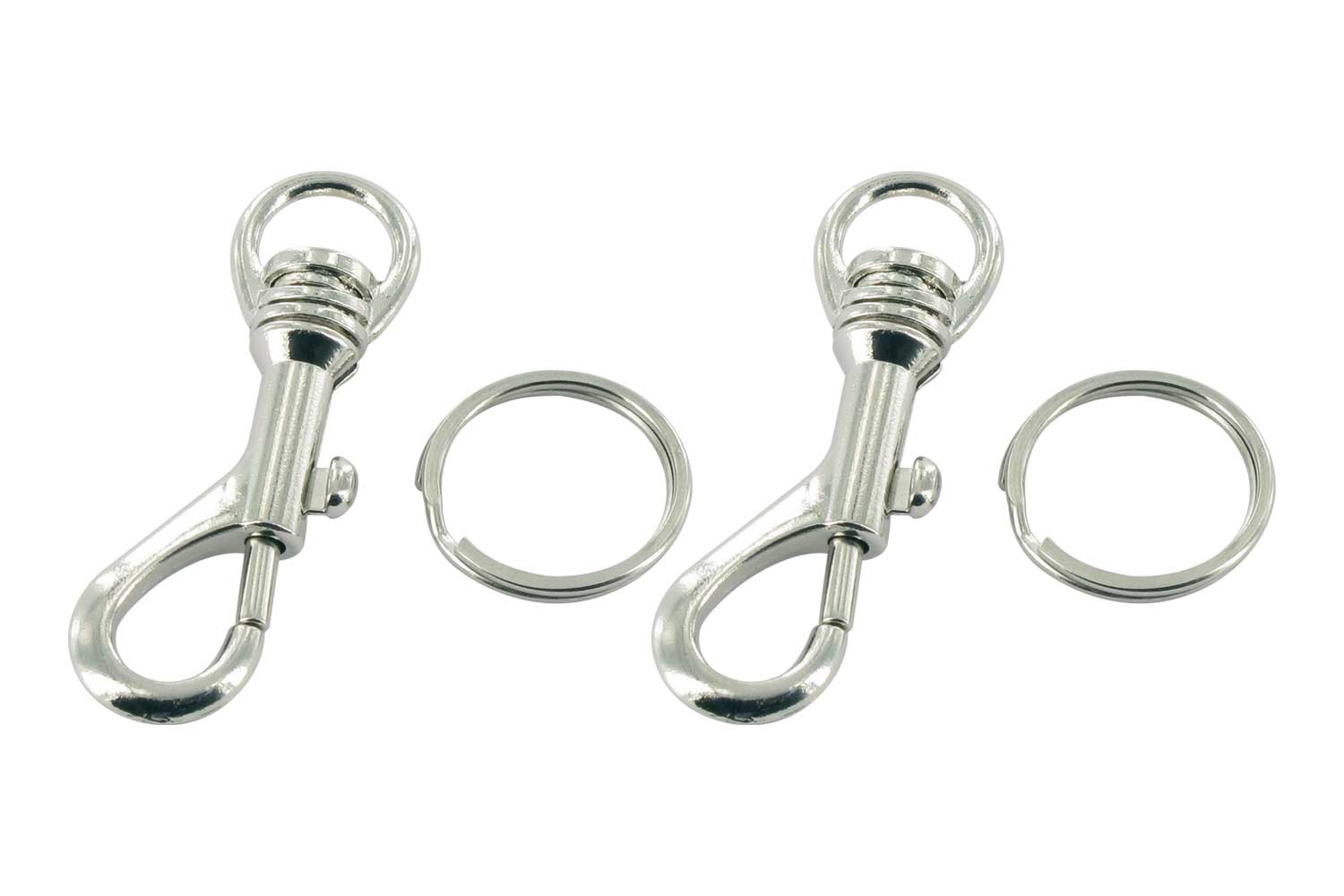 Llaveros mosquetones de metal plateado con anillos rotos. El mosquetón está sobre un eje giratorio que le permite rotar sobre todo el eje.