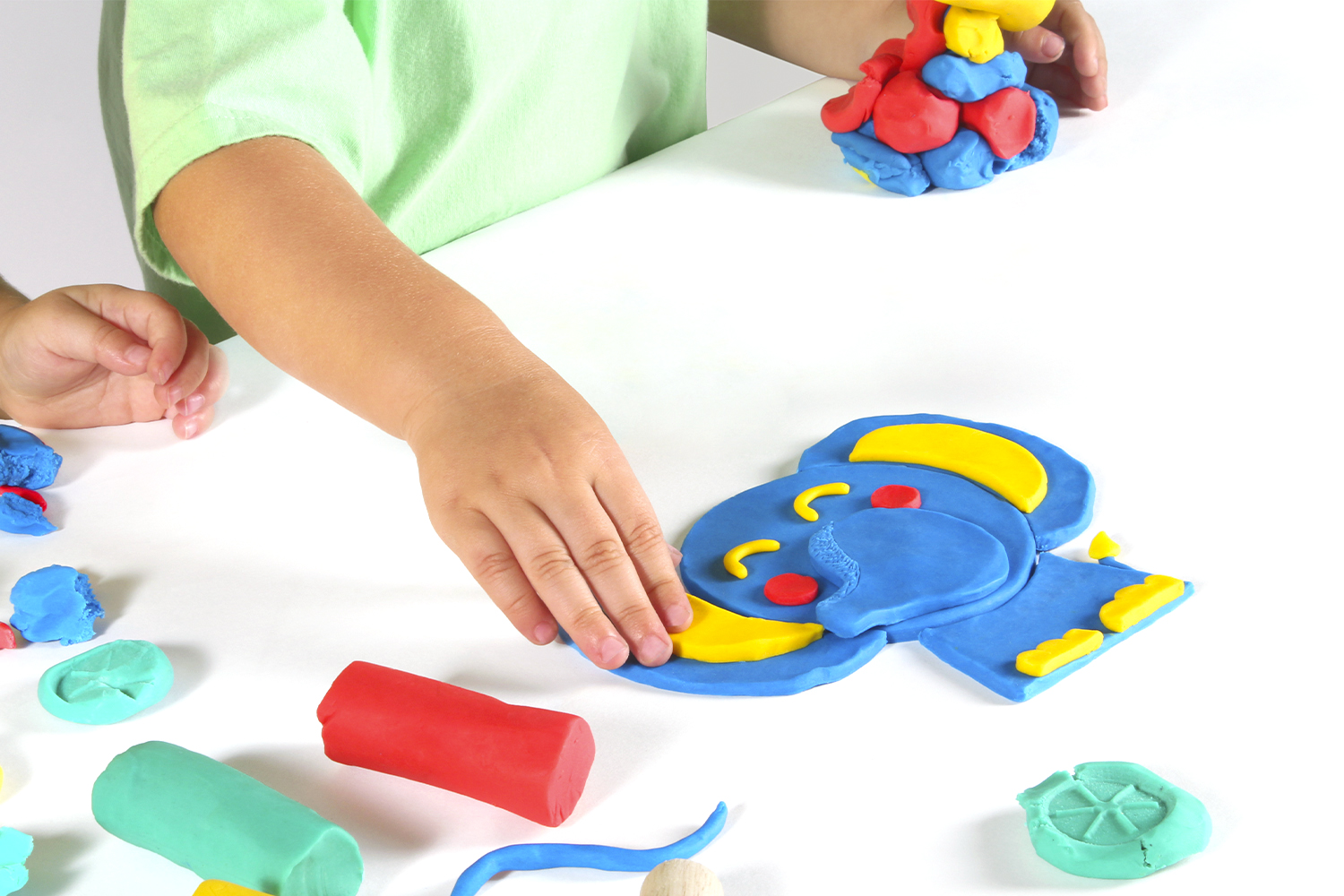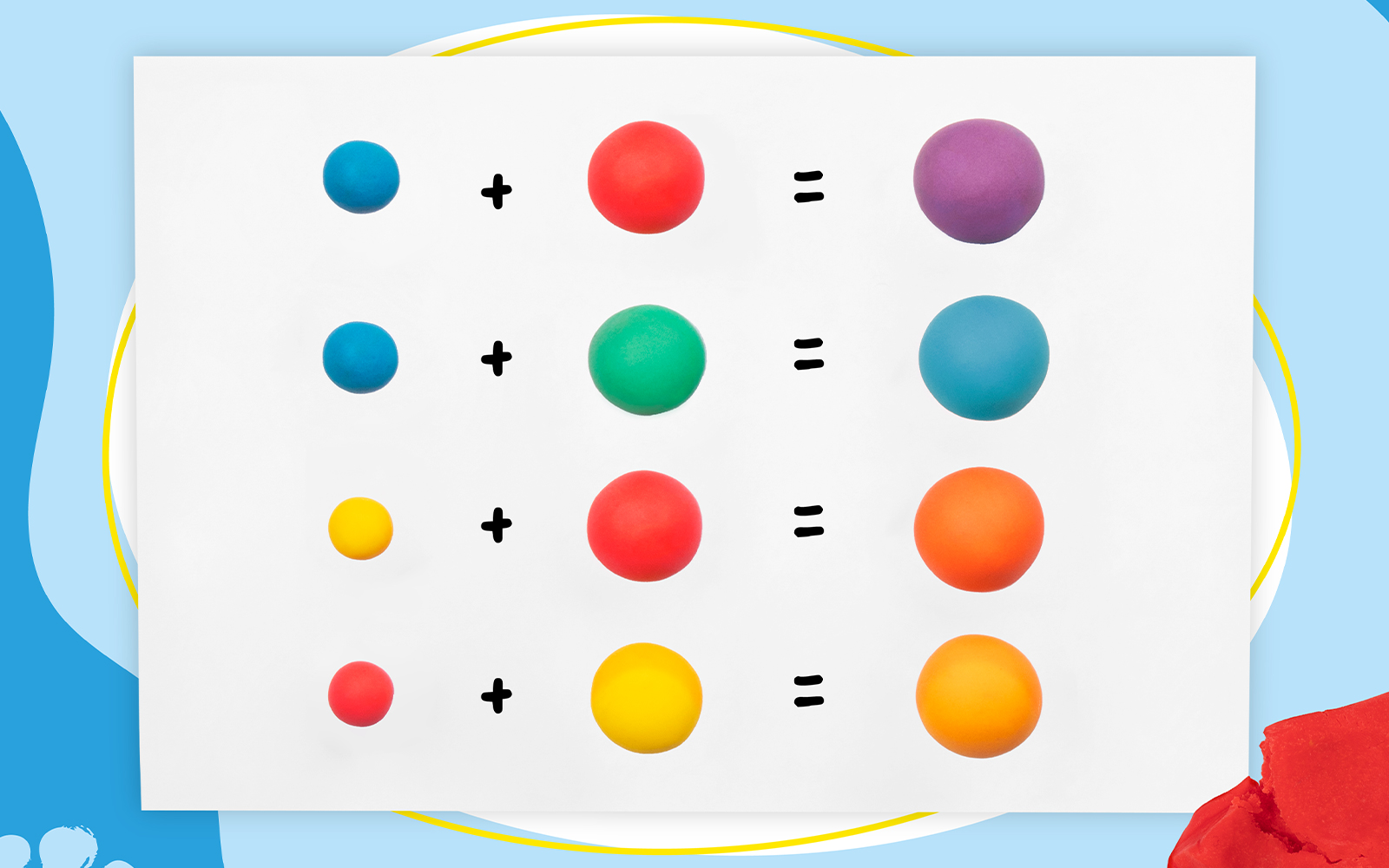 Cada cubo contiene 12 bloques de pasta a modelar en 4 colores: rojo, amarillo, verde, azul.